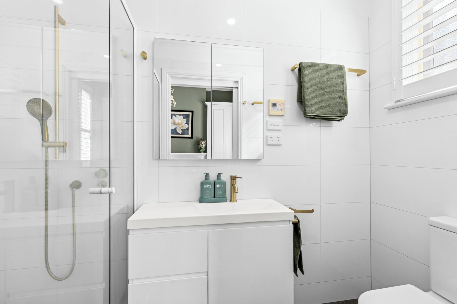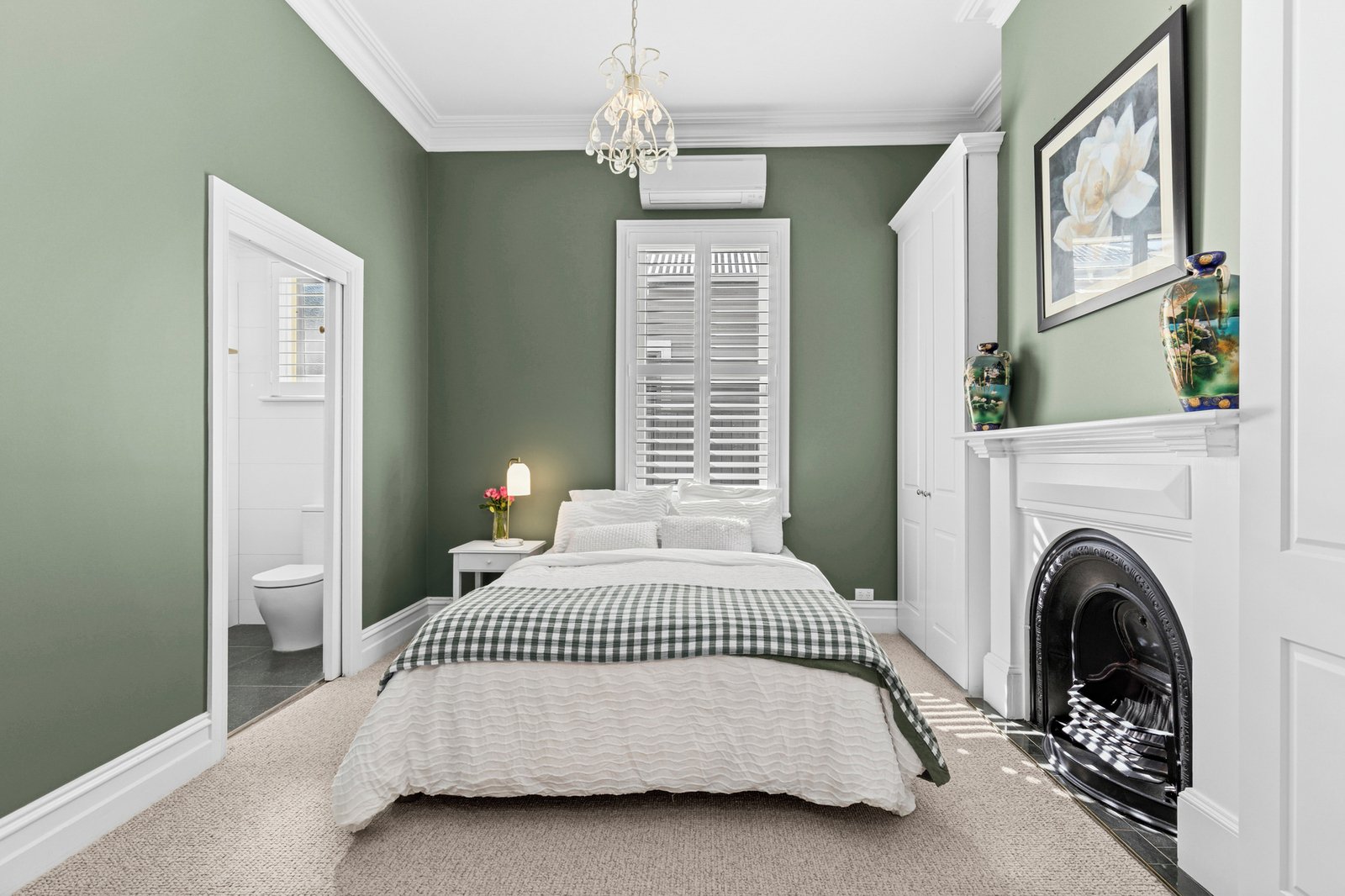 - Master bedroom featuring built-in robes, split system heating and cooling, and private ensuite featuring shower, vanity and toilet