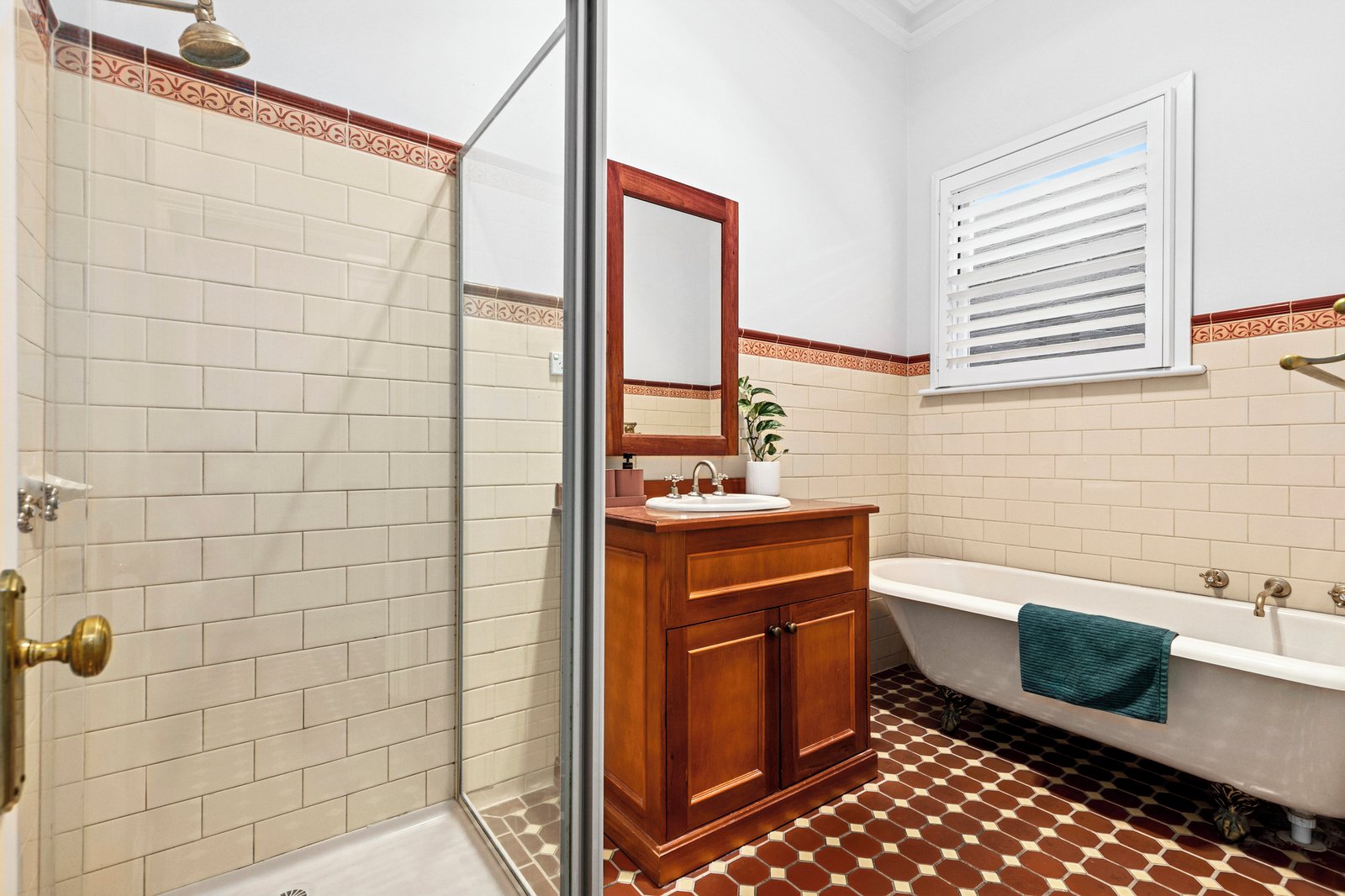 - Central bathroom featuring bath, shower, vanity and separate toilet