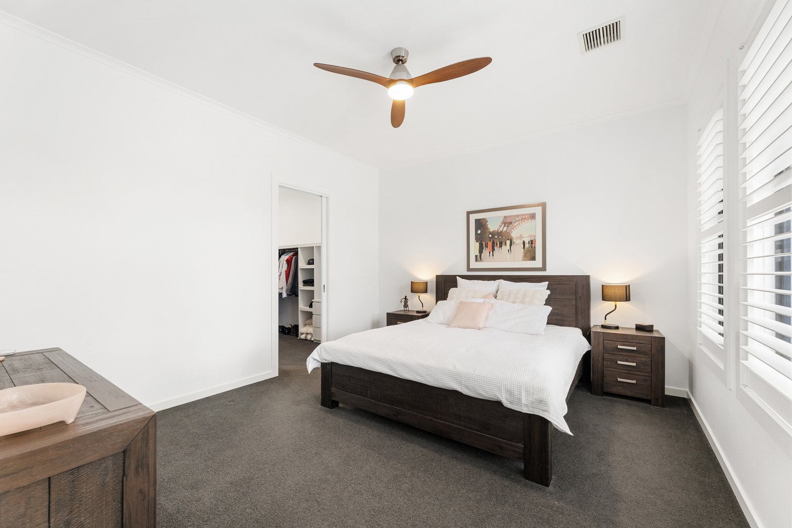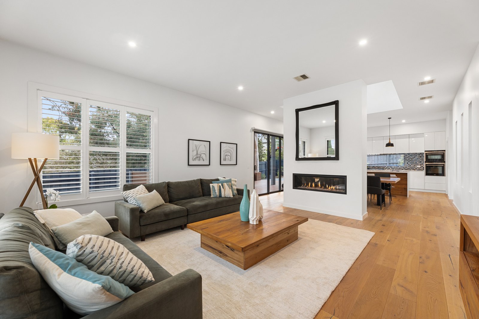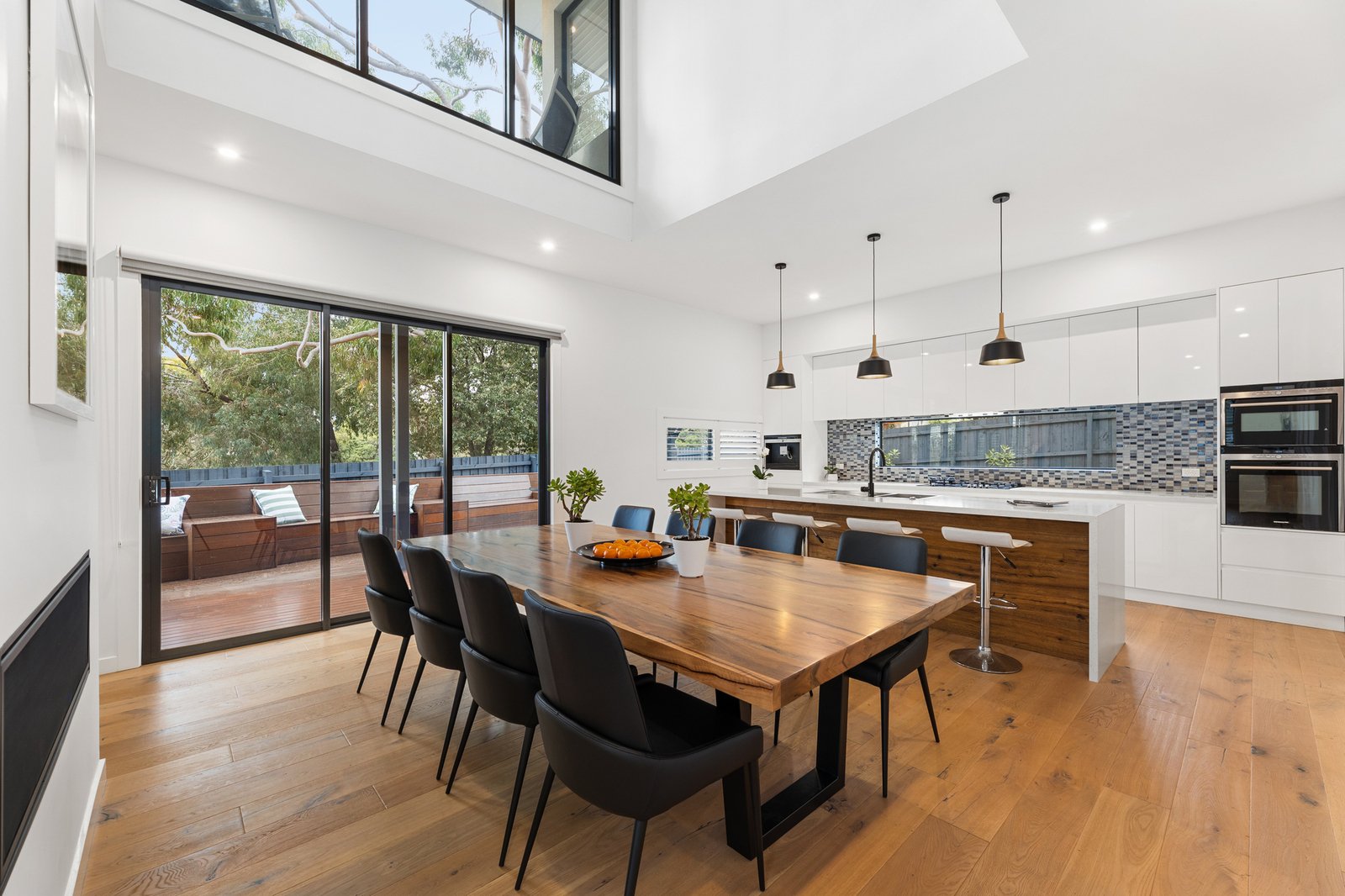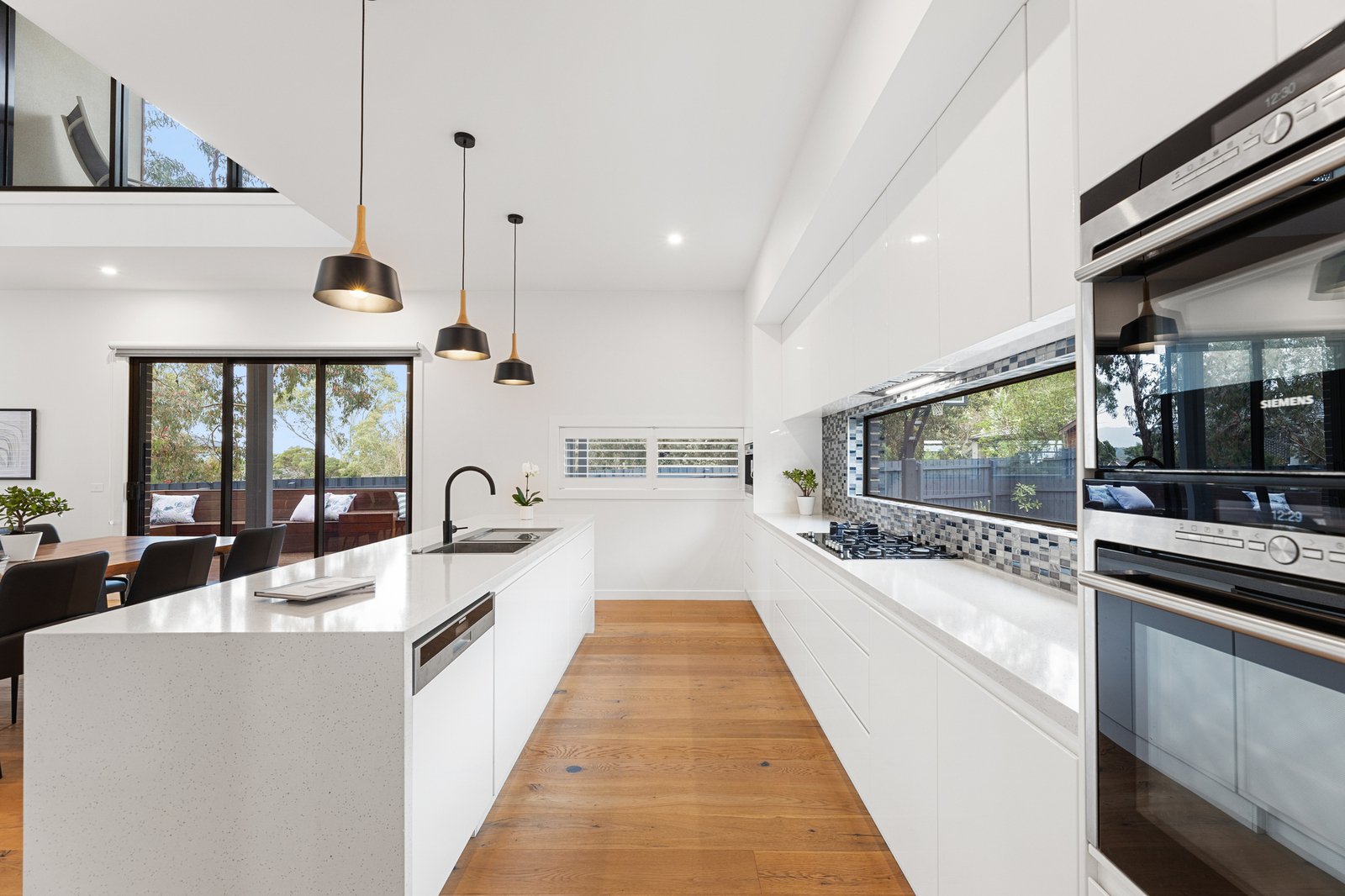 A large showcase kitchen celebrates the high ceilings overhead and comes equipped with prestige Siemens appliances including a seamless integrated dishwasher, double self-cleaning ovens and in-built coffee machine. There is a large island bench, stone benchtops and a butler’s pantry.