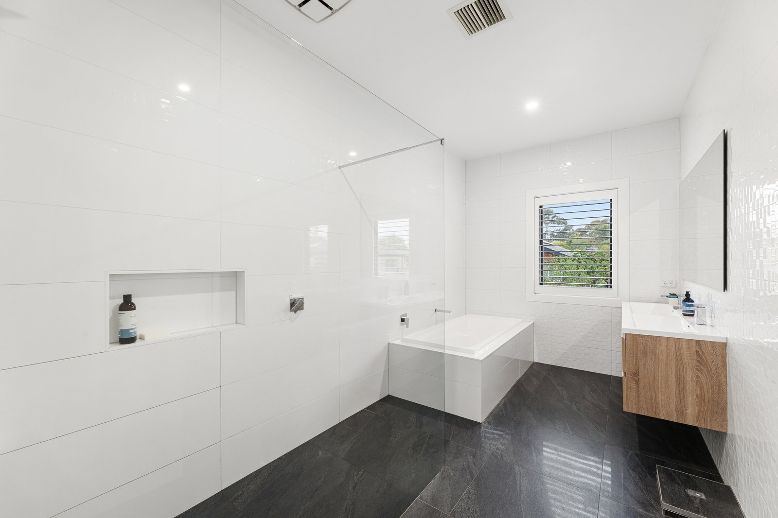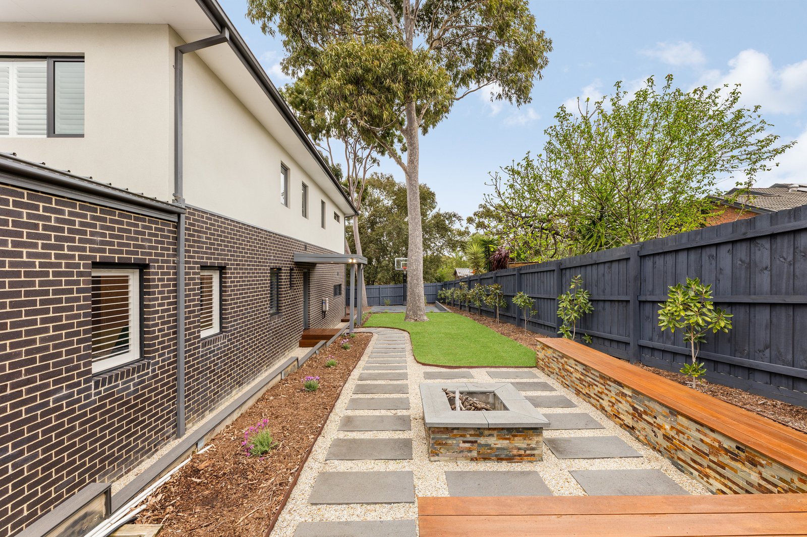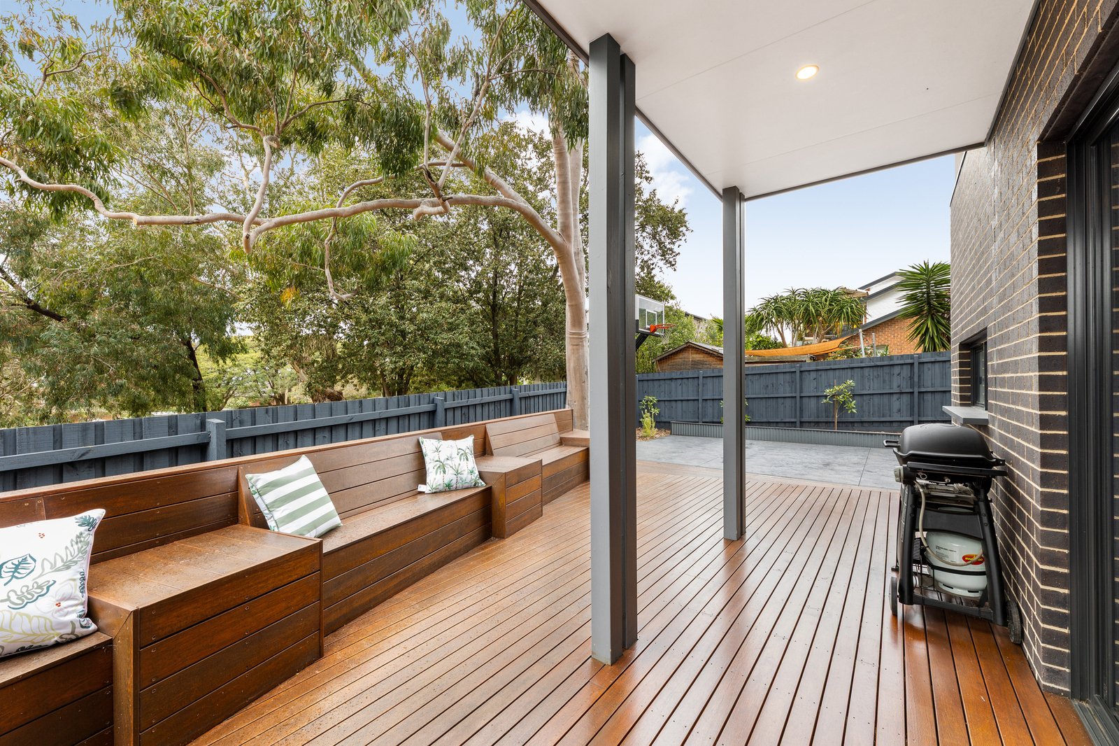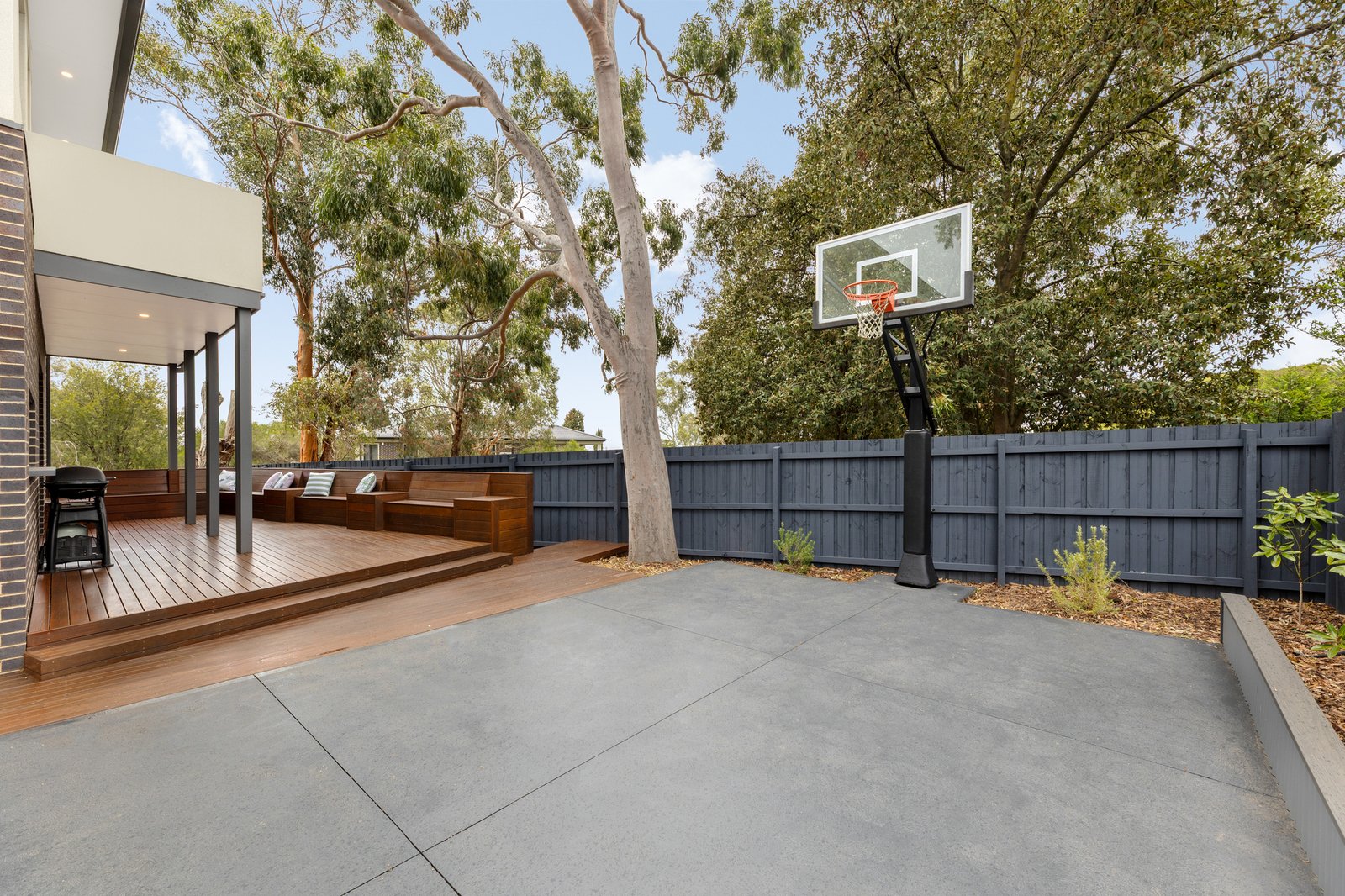 A basketball court with premium Mega Slam height adjustable basketball ring is integrated within fully landscaped gardens, perfect for kids and pets to enjoy. Ample decking abounds the property with integrated fire pit seating and a productive vegetable and fruit garden for the home cook.