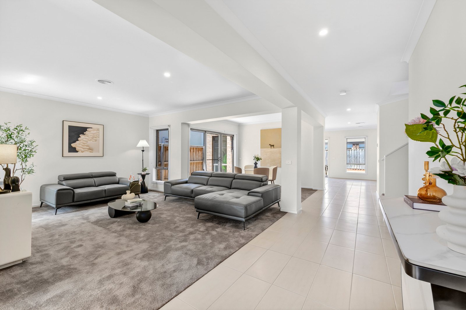 Downstairs, a welcoming lounge is complemented by separate dining, flowing through to an open family and meals zone that connects seamlessly to the outdoor entertaining area and lawn. The kitchen is designed for real life, with a large island bench, sleek cabinetry, and quality cooking appliances that keep you in the conversation while dinner gets done.