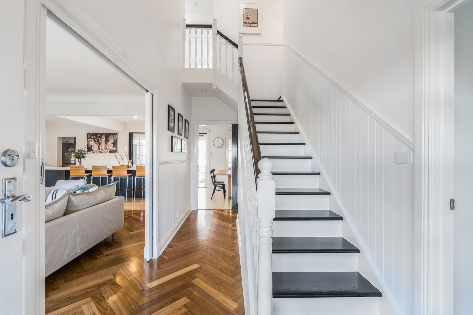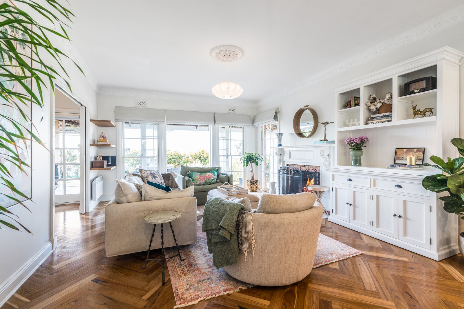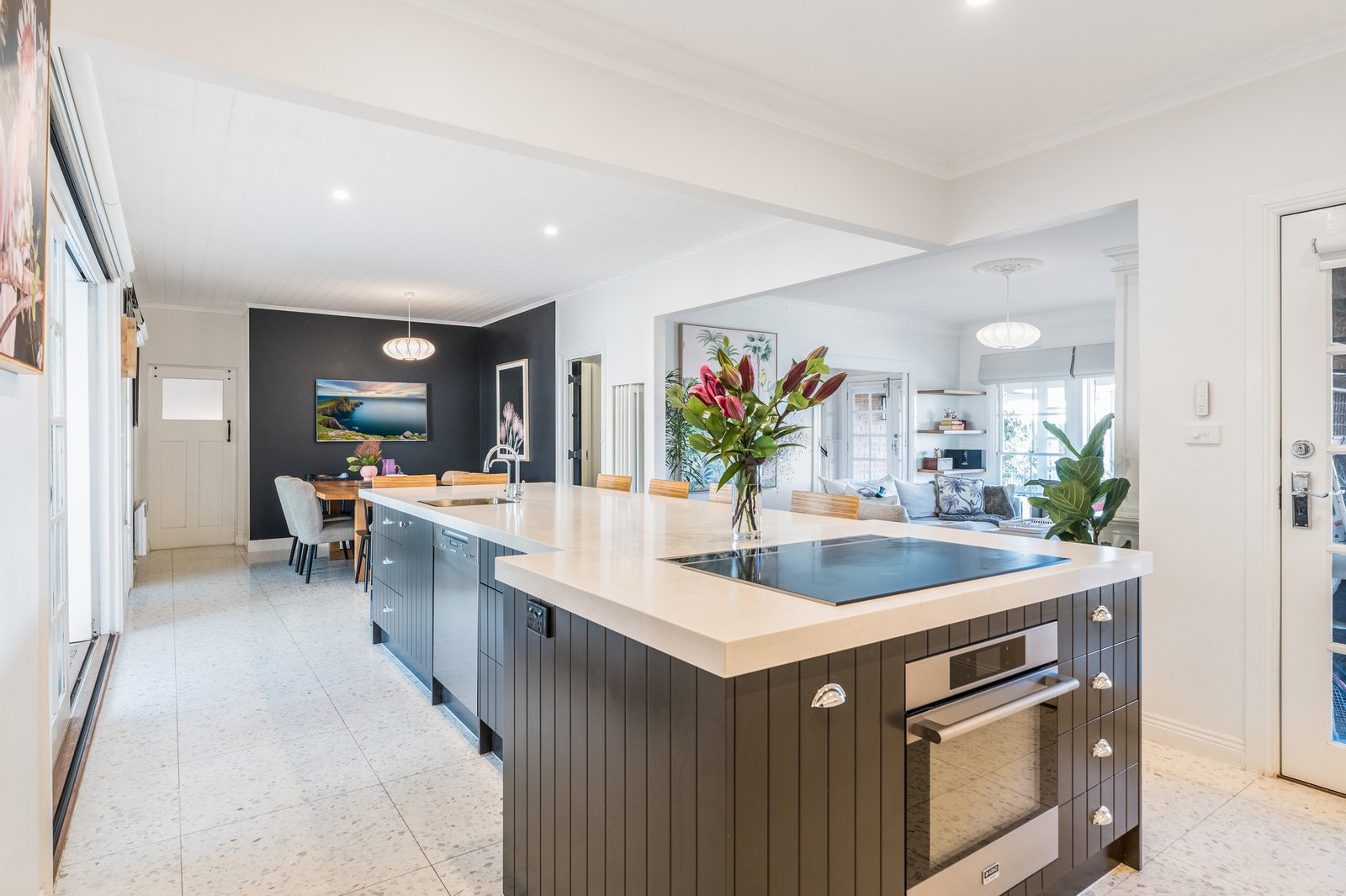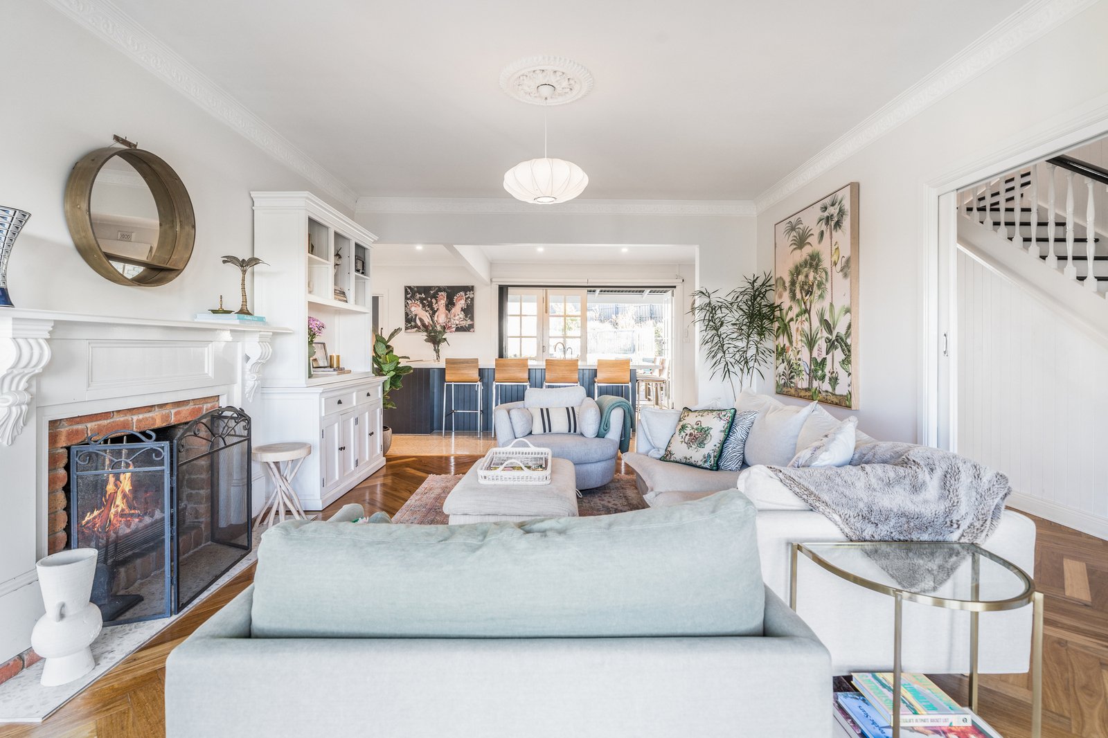 Set behind a picket fence and established gardens, the red brick façade and wrap-around verandah are captivating in appeal. Stepping inside, a central staircase, dado walls, and stunning herringbone timber floors introduce the sophisticated style within. A formal lounge off the entry features a beautiful fireplace as its centrepiece, ornate cornice, a ceiling rose and designer pendant lighting, offering an ambient space to retreat or entertain. The open plan layout flows through to the adjoining kitchen and dining area. The high-end entertainer’s kitchen features a large central island designed to gather around and keep the chefs of the home company. Quality appointments include stone benchtops, 600mm Asko oven, induction cooktop, Miele dishwasher, filtered water taps, inset sink in the island, double sink, plus an impressive butler’s pantry with a second oven, in-built Miele coffee machine, additional Miele dishwasher, third sink, and generous storage provisions. Direct access from the butler’s pantry and kitchen into the alfresco, ensures effortless indoor-outdoor entertaining.