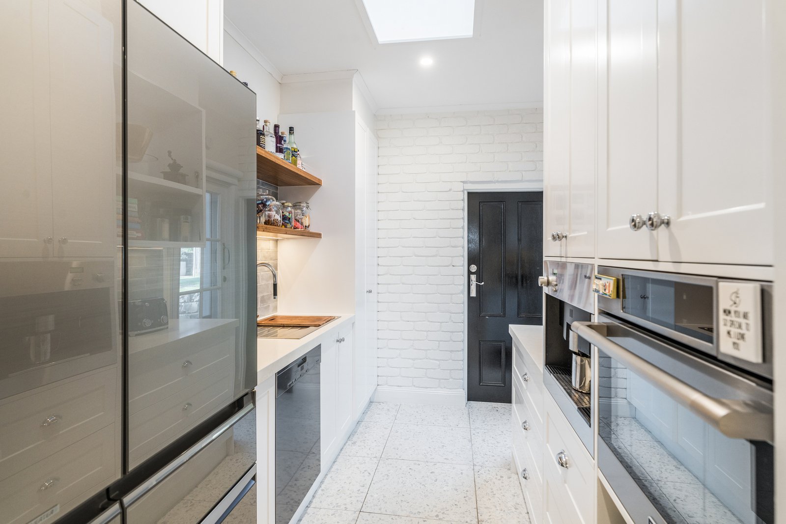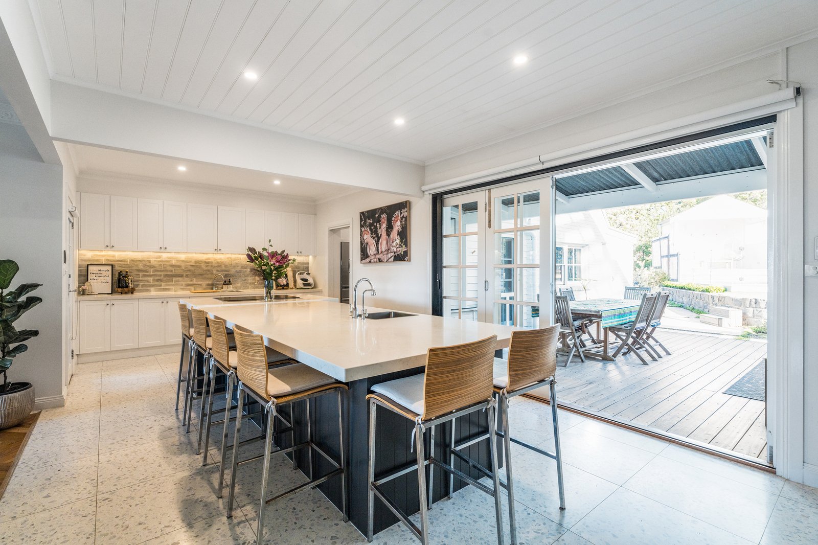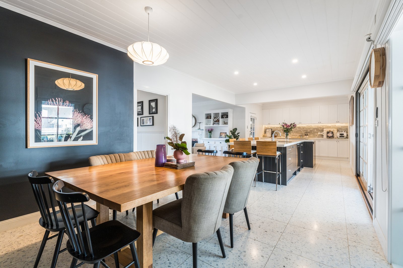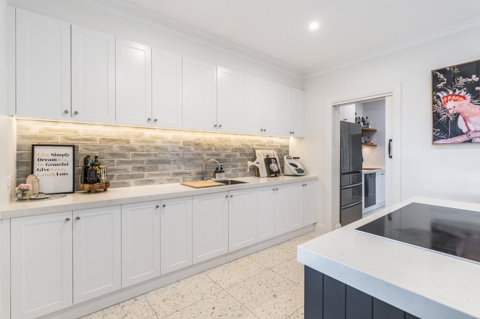 Set behind a picket fence and established gardens, the red brick façade and wrap-around verandah are captivating in appeal. Stepping inside, a central staircase, dado walls, and stunning herringbone timber floors introduce the sophisticated style within. A formal lounge off the entry features a beautiful fireplace as its centrepiece, ornate cornice, a ceiling rose and designer pendant lighting, offering an ambient space to retreat or entertain. The open plan layout flows through to the adjoining kitchen and dining area. The high-end entertainer’s kitchen features a large central island designed to gather around and keep the chefs of the home company. Quality appointments include stone benchtops, 600mm Asko oven, induction cooktop, Miele dishwasher, filtered water taps, inset sink in the island, double sink, plus an impressive butler’s pantry with a second oven, in-built Miele coffee machine, additional Miele dishwasher, third sink, and generous storage provisions. Direct access from the butler’s pantry and kitchen into the alfresco, ensures effortless indoor-outdoor entertaining.