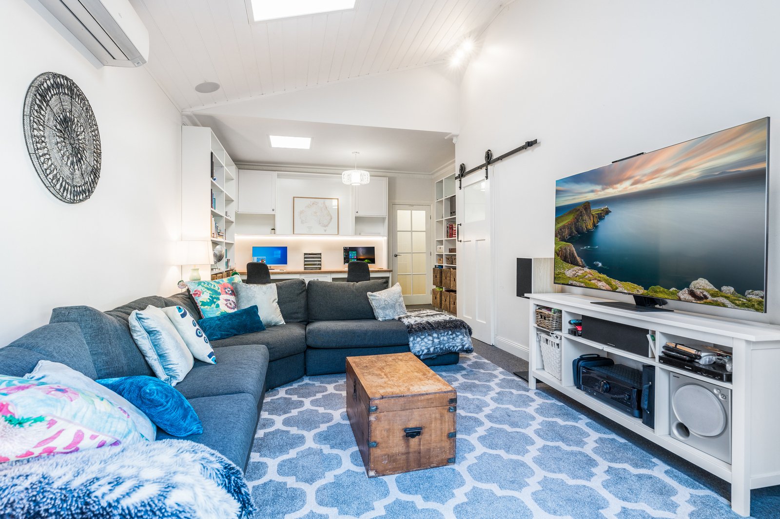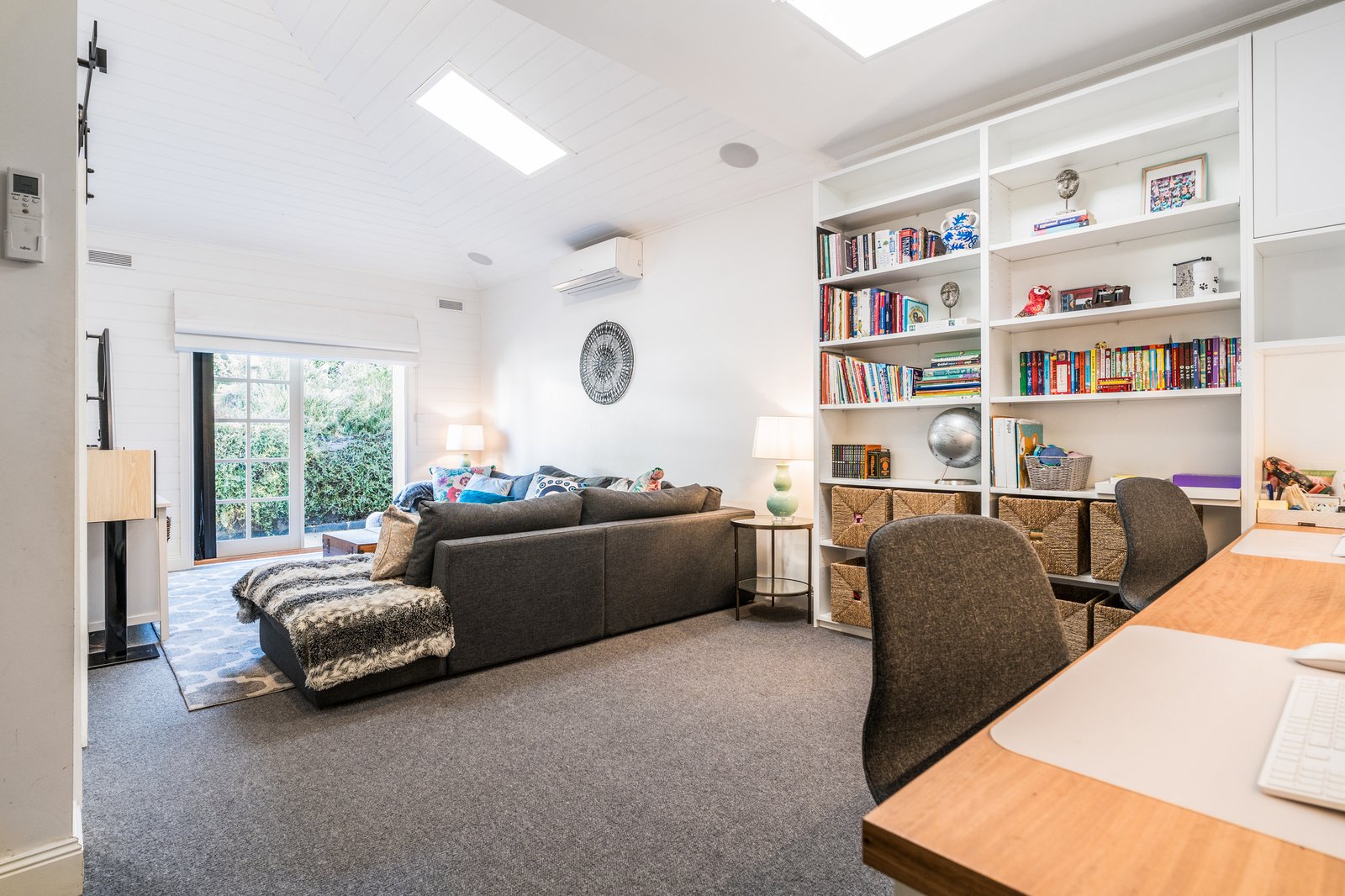 A second living room features skylights, timber-lined vaulted ceilings, and a country style barn door, offering an inviting space to retreat, watch a movie, or send the kids to play. Also equipped with built-in workstations, storage, a sound system, and French door access to the backyard, this room delivers fantastic versatility for family living.
