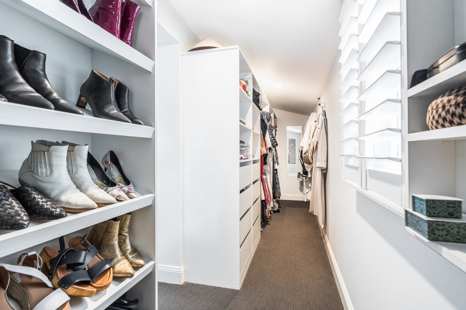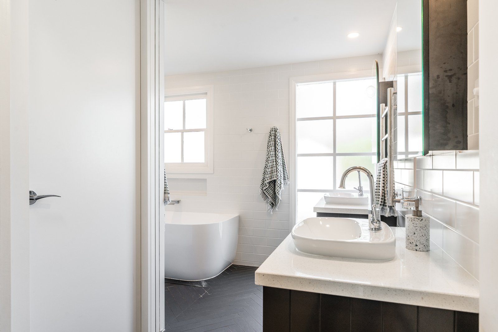 The luxurious ground floor main bedroom includes generous walk-in robes, and ensuite with frameless glass dual shower, stone-topped double vanity, and a separate wc. Upstairs, three additional bedrooms include built-in robes, with a fifth room offering a versatile space as a bedroom, study, or guest room with a built-in day bed, storage, and walk-in robe. A stylish bathroom on this level is finished in floor-to-ceiling subway tiles, with open shower, freestanding bath, heated towel rail, dual vanities, and a clever design to create a separate wc