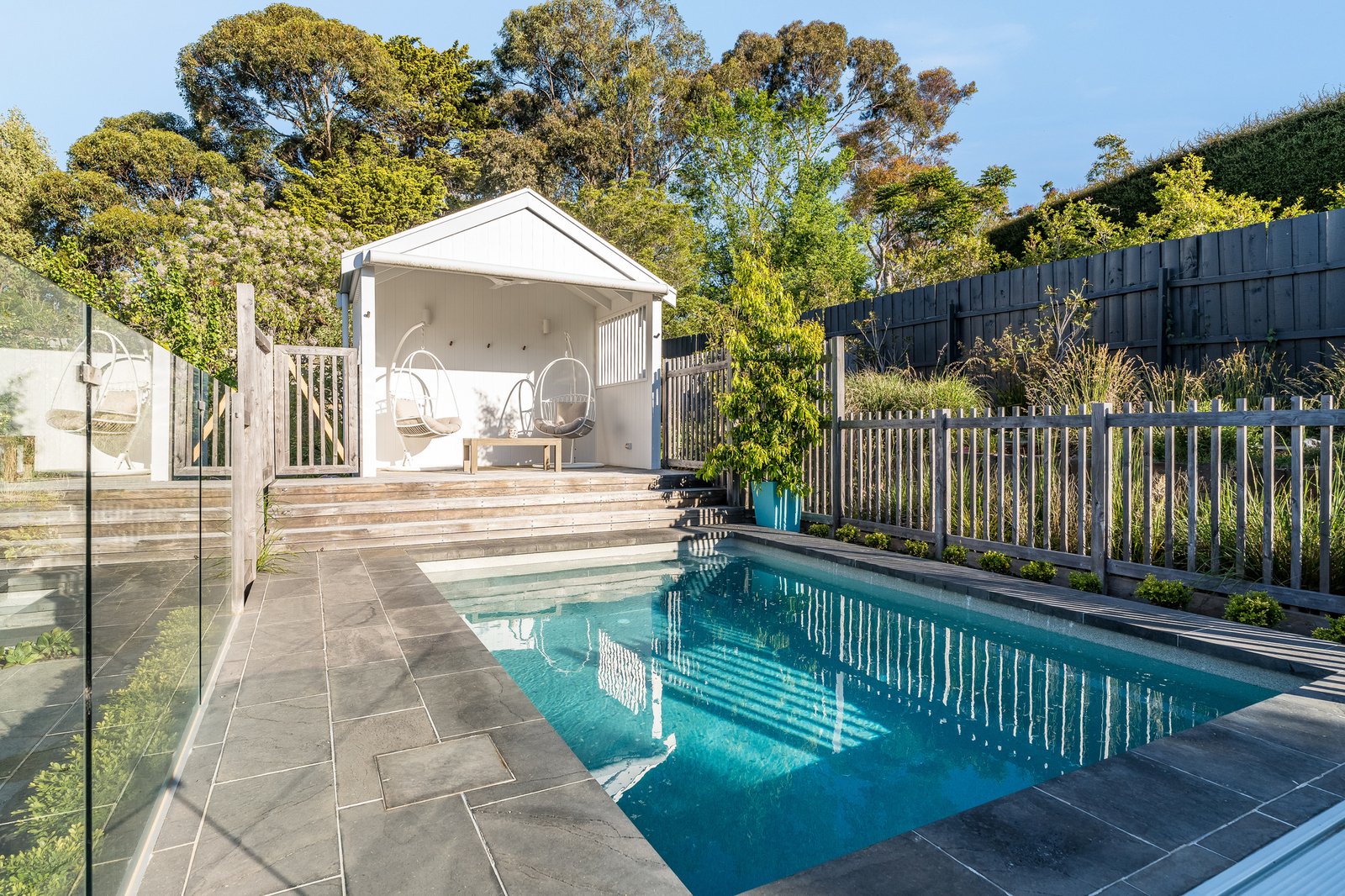 Outside, the spacious undercover alfresco allows ample space for dining and lounging zones. Beautifully landscaped gardens lead to the heated in-ground magnesium pool, complete with a shady cabana with retracting awning and fan for luxurious poolside lounging. Established hedges and well-maintained gardens create a private and tranquil environment, with an automated irrigation system for easy upkeep. An externally accessed bathroom with wc and shower ensures no wet feet in the house on a summer’s day. Garaging includes workshop facilities, with rear roller door access to the backyard, and an adjoining garden storeroom.