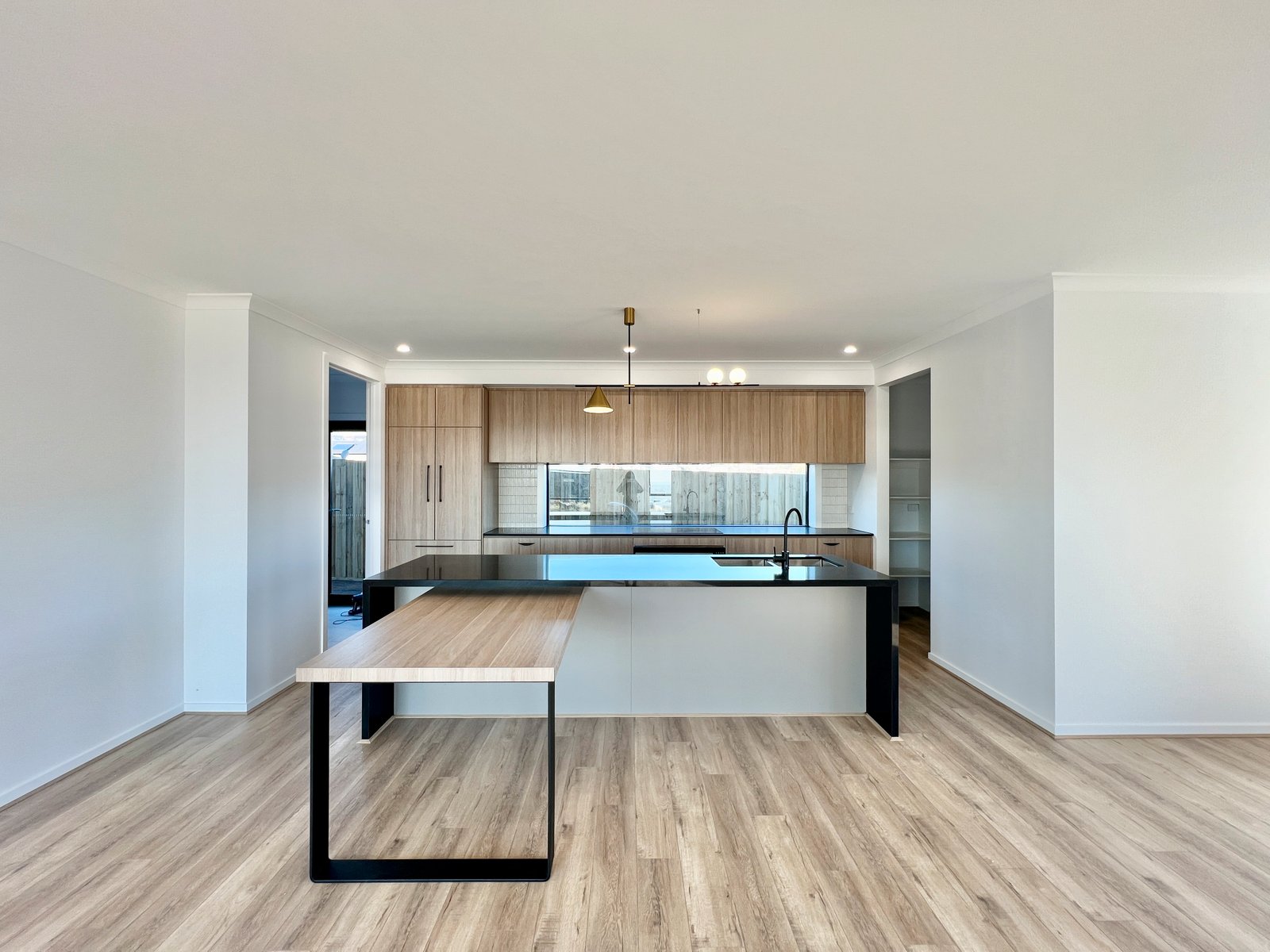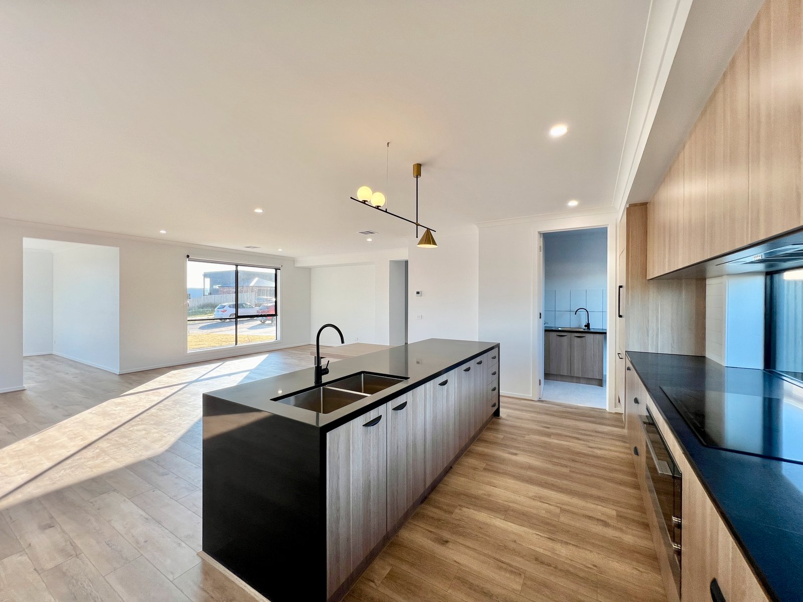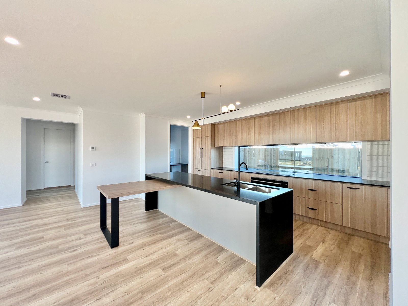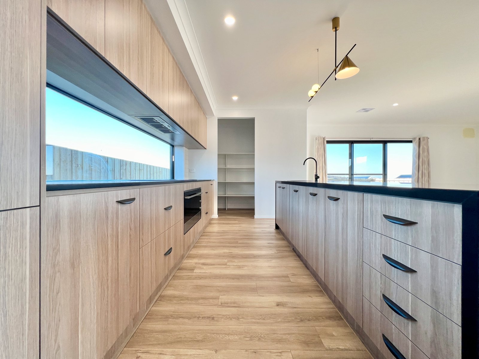 - The kitchen features stone benches and a laminate breakfast bar, stunning pendant lighting, integrated fridge and dishwasher, induction cooktop, electric oven, walk in pantry and window splash back