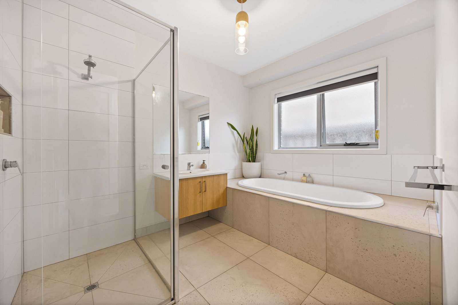 - Central bathroom with shower, bath and vanity