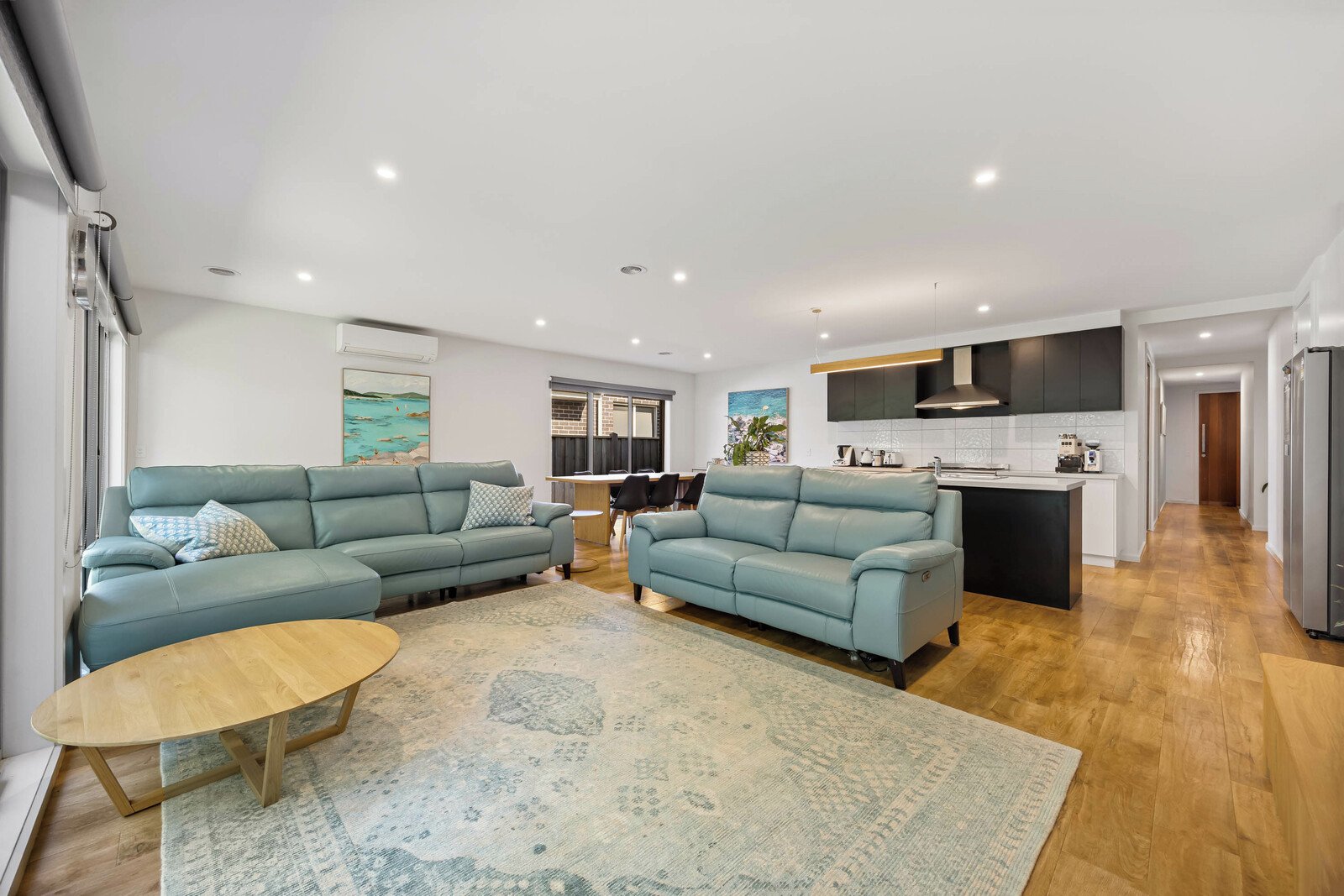 - Open-plan kitchen, dining and living area with split system