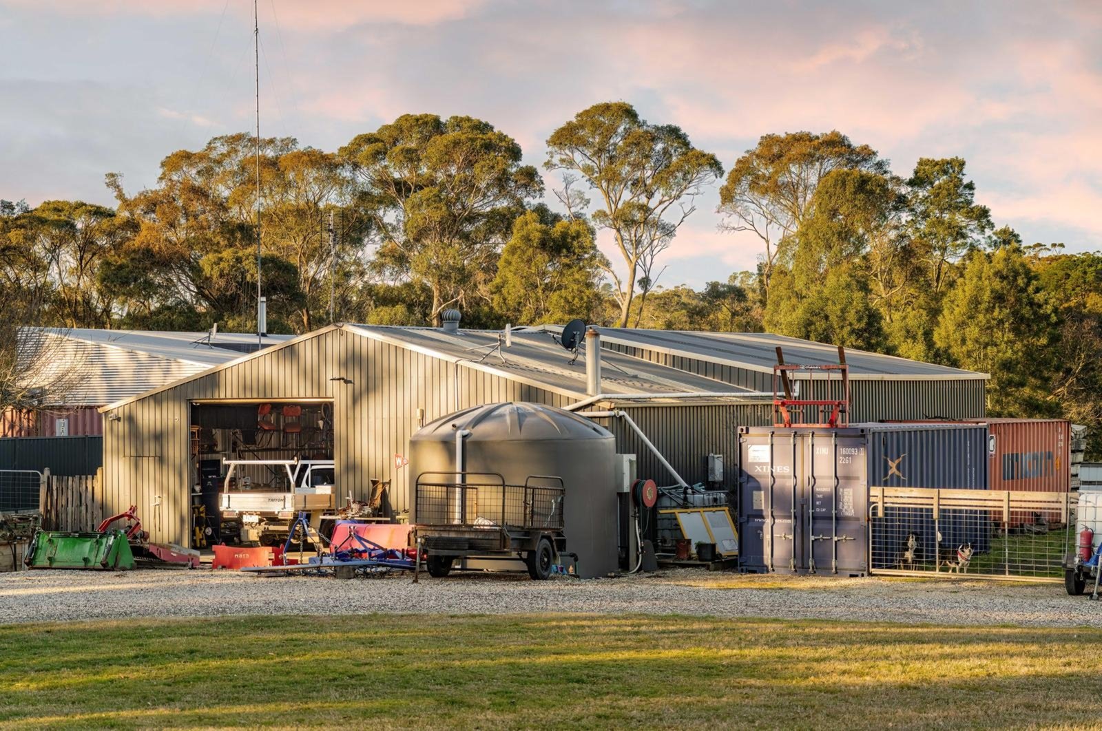 The infrastructure is unmatched, headlined by a monumental 30m x 12m powered shed with a private office, kitchenette, mezzanine, toilet and its own solar array - the ultimate setup for a home business, car collection, or serious workshop. Two shipping containers afford further storage options. Beyond the shedding, the property is expertly divided into four paddocks and secured by electric gate entry, featuring exceptional water security via four dams and three large fire-connected tanks.