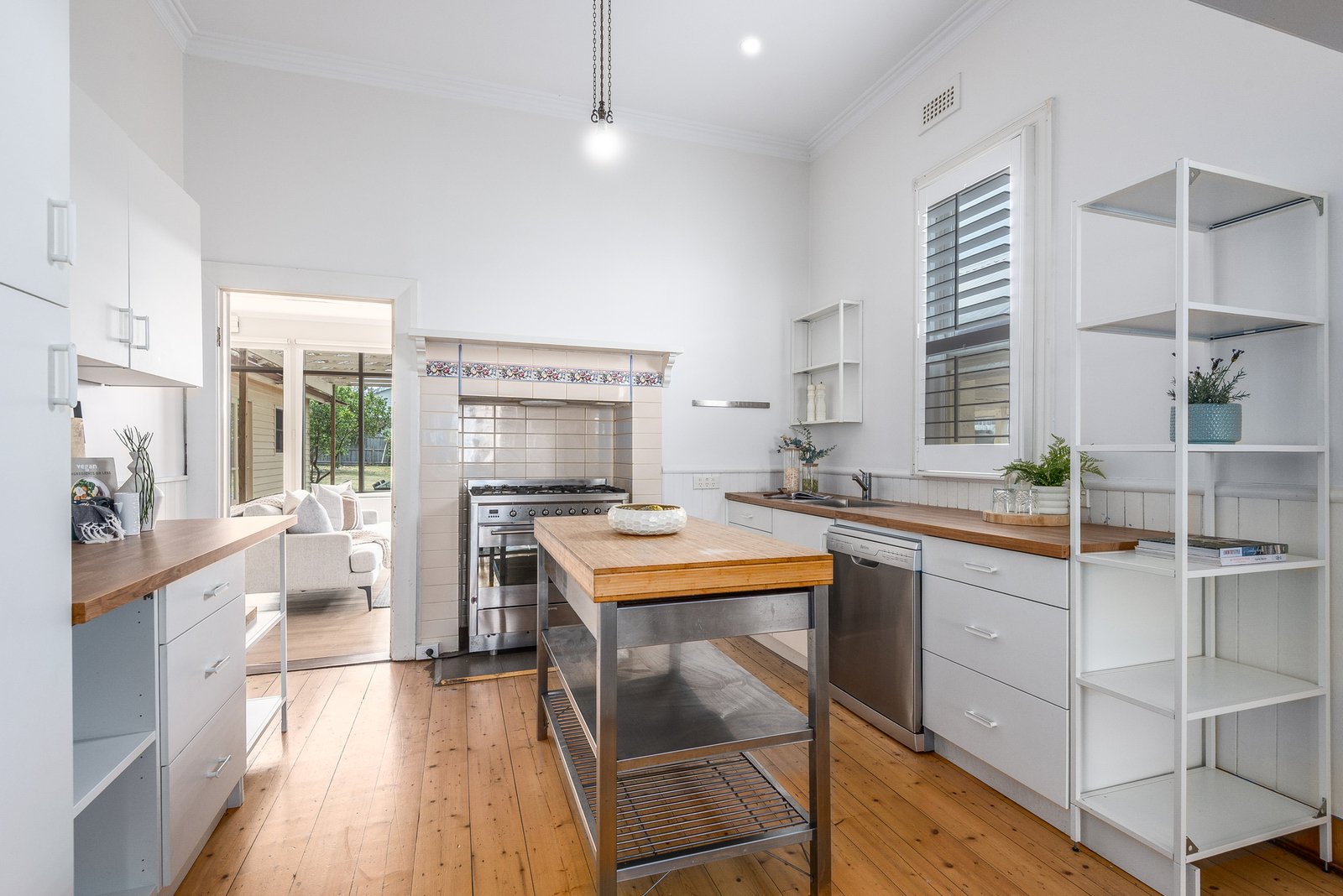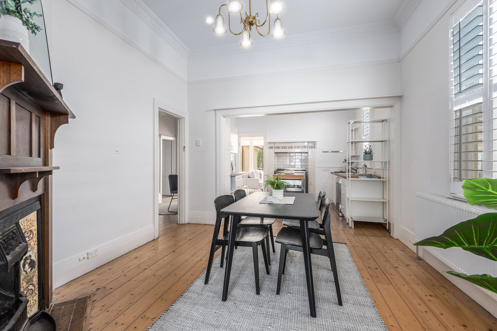 The elegant façade and leadlight windows present timeless appeal. Inside, a central hallway showcases high ceilings, polished timber floors, and ornate timber fretwork. Off the entry, the formal lounge offers a sophisticated space to retreat, featuring ornate cornice and ceiling detail, pendant lighting, picture rails, and classic plantation shutters. The adjoining dining area retains an original mantel and fireplace, seamlessly flowing into the kitchen for easy entertaining. The kitchen is equipped with modern appliances including a 900mm Smeg oven and cooktop, and dishwasher. A spacious second living area to the rear connects with the alfresco, perfect for indoor-outdoor living and entertaining.