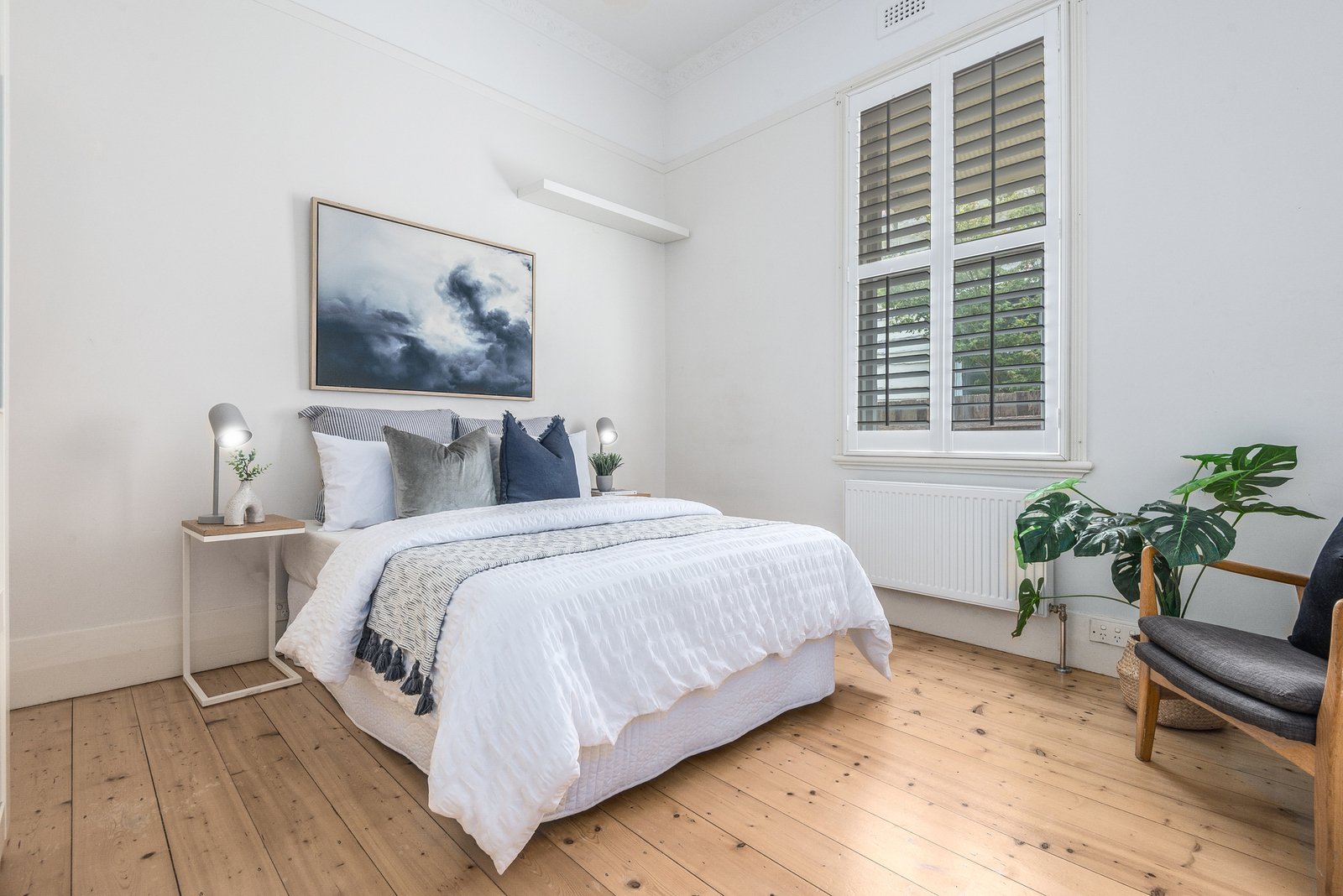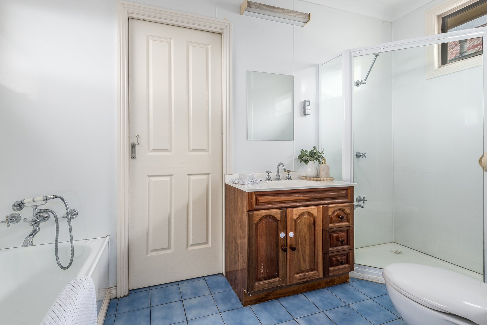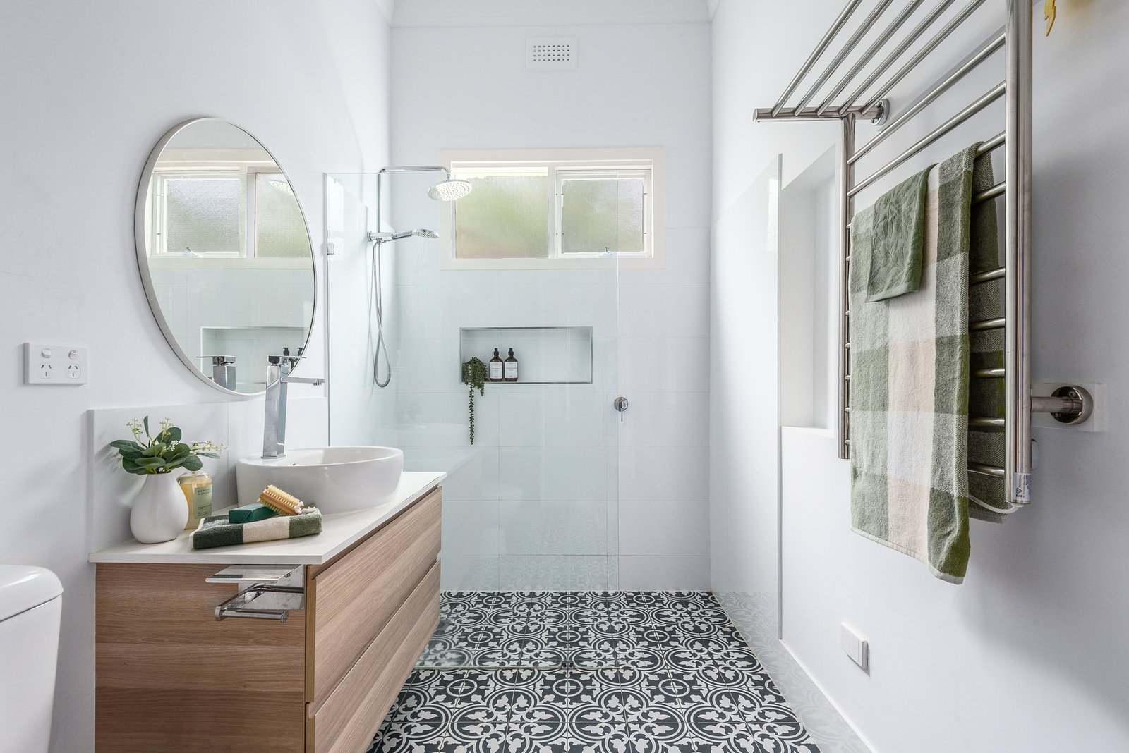 The main bedroom is privately zoned at the rear, expansive in size with space to retreat, adjoining an ensuite with bath and separate shower. Three further bedrooms are serviced by a tastefully updated main bathroom featuring a frameless glass walk-in shower, modern stone-topped vanity, and heated towel rail. A central study offers the ideal space to work from home.