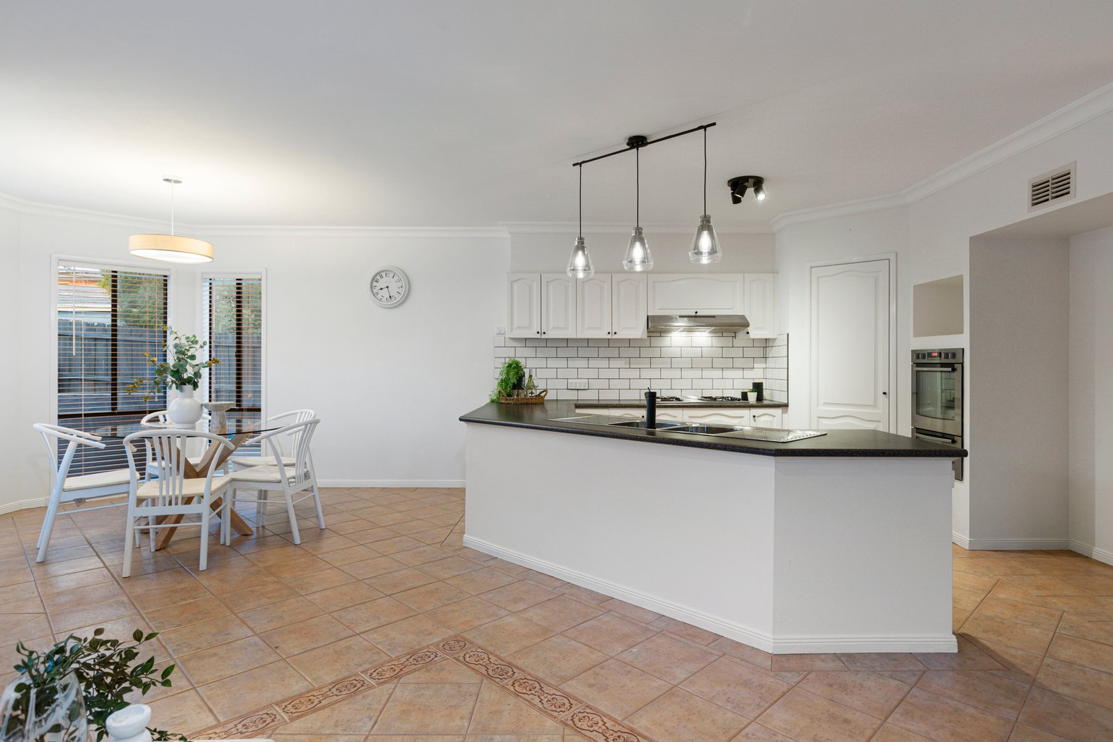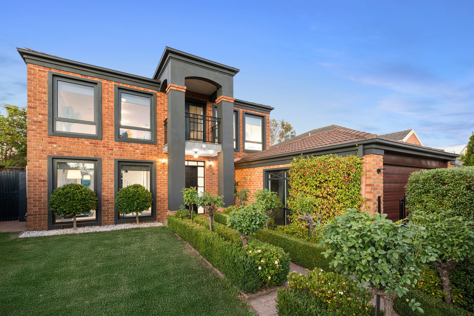 Looking out across the treetops from its elevated hillside position, the façade of the corner-sited home makes a lasting first impression, while its established, manicured gardens, which include a row of fragrant roses, lead to the welcoming interiors beyond.