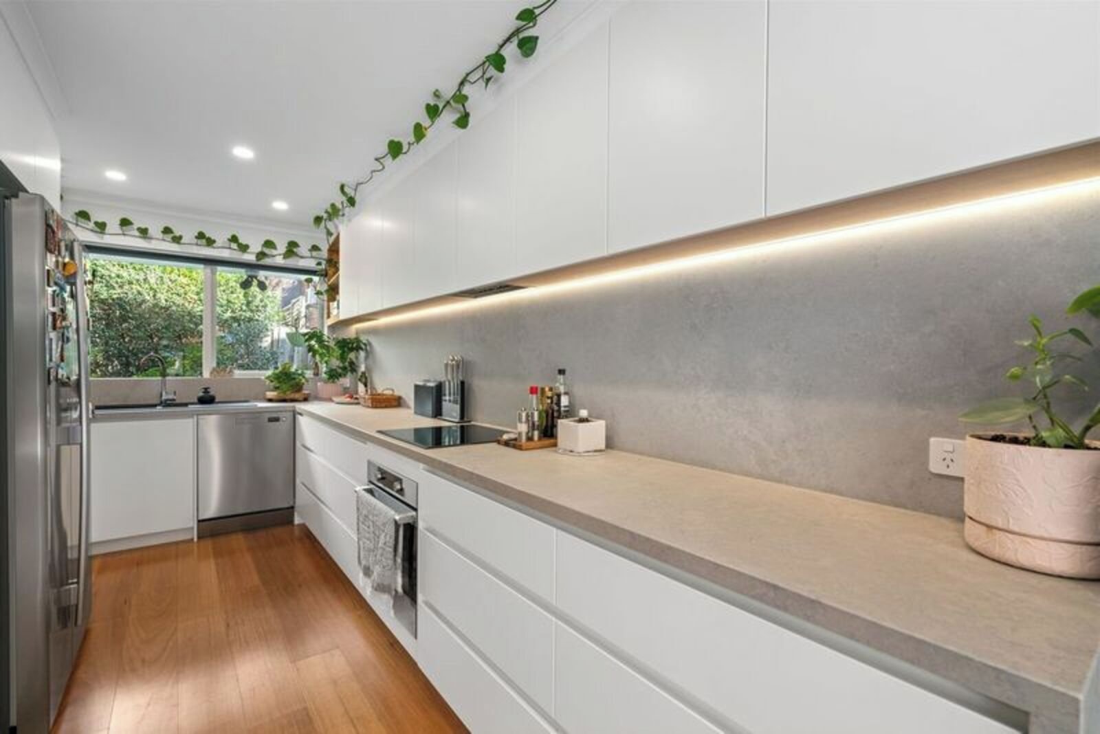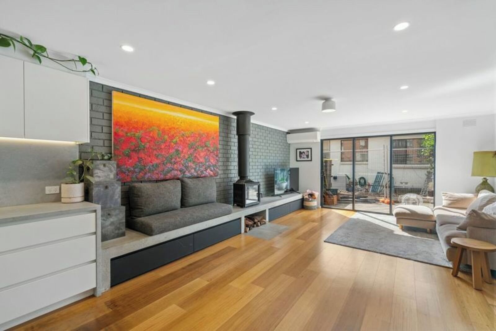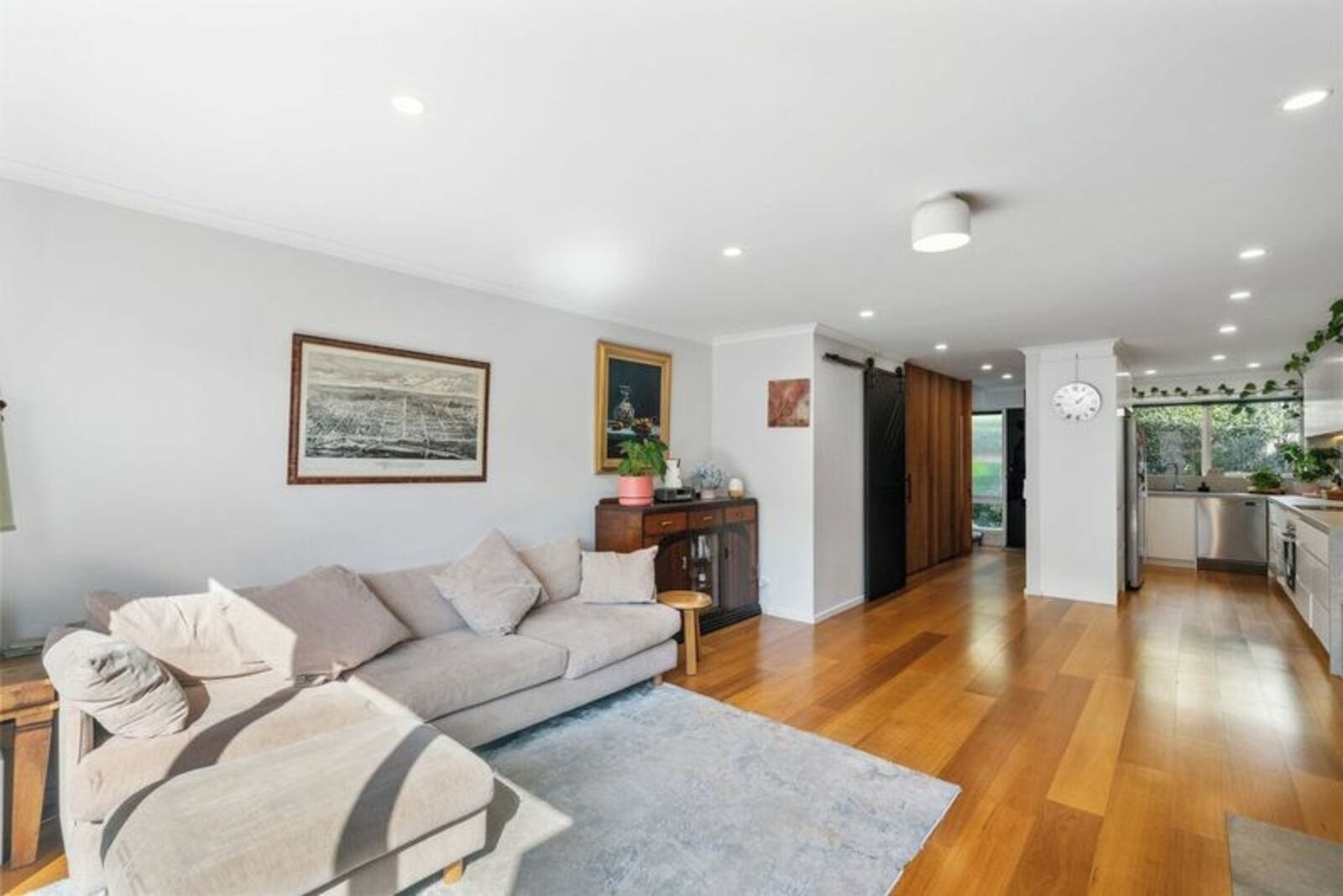 An impressively proportioned north-facing open-plan living room frames views across the tranquil courtyard which is sized for entertaining, while floorboards expand internally to adjoining kitchen with near new custom cabinetry, dishwasher and impressive storage/bench space.