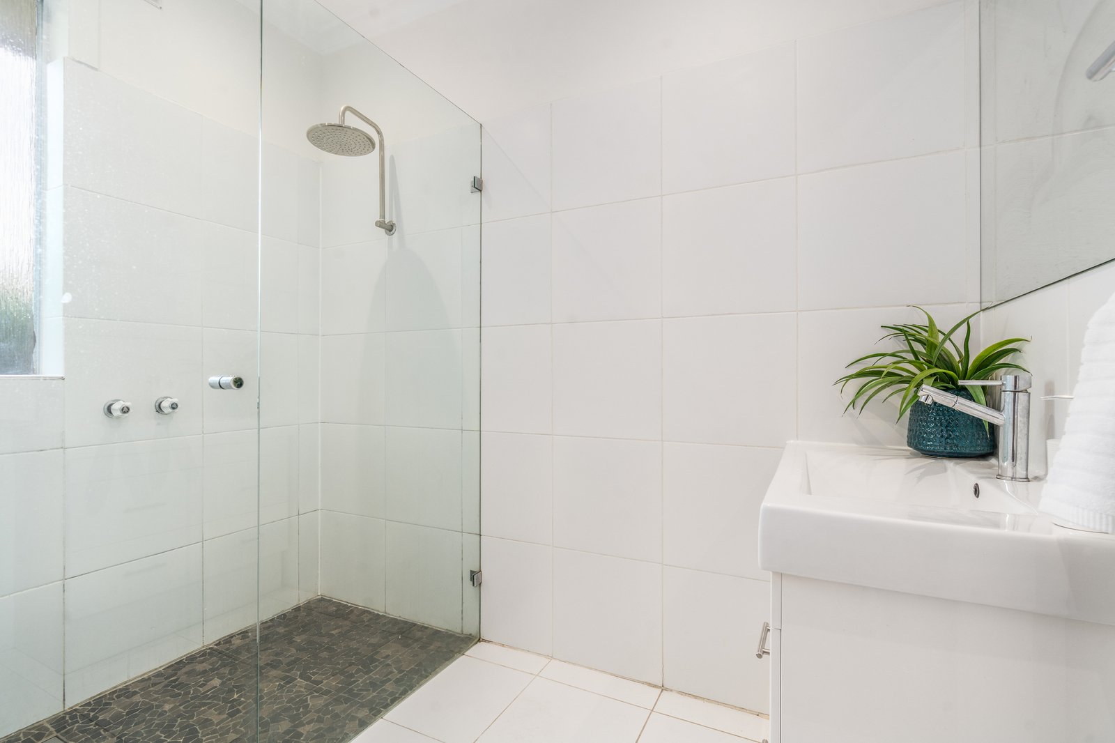 The home comprises three bedrooms, two with built-in robes and one with freestanding robes. The central bathroom is presented in contemporary finishes with a frameless walk-in double shower, modern vanity and a separate wc. The laundry is equipped with a custom-built ironing station, and generous linen storage adds further functionality.