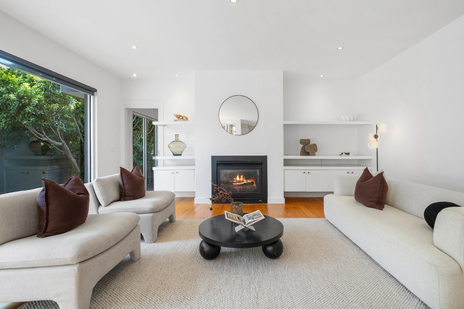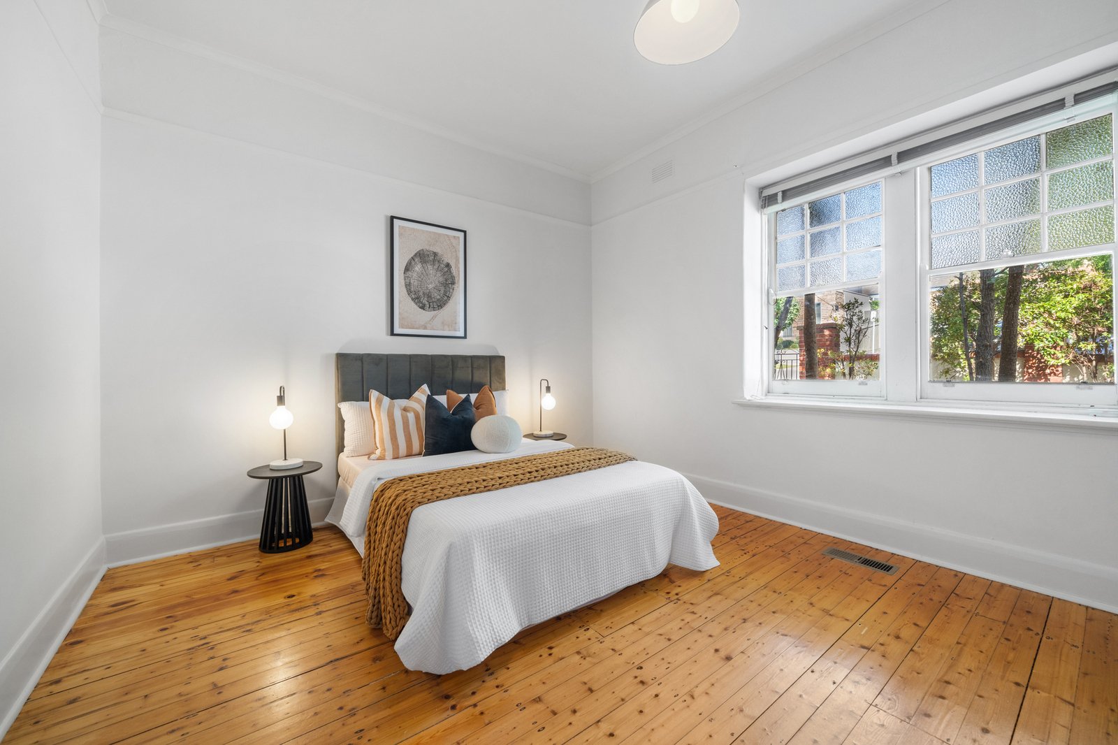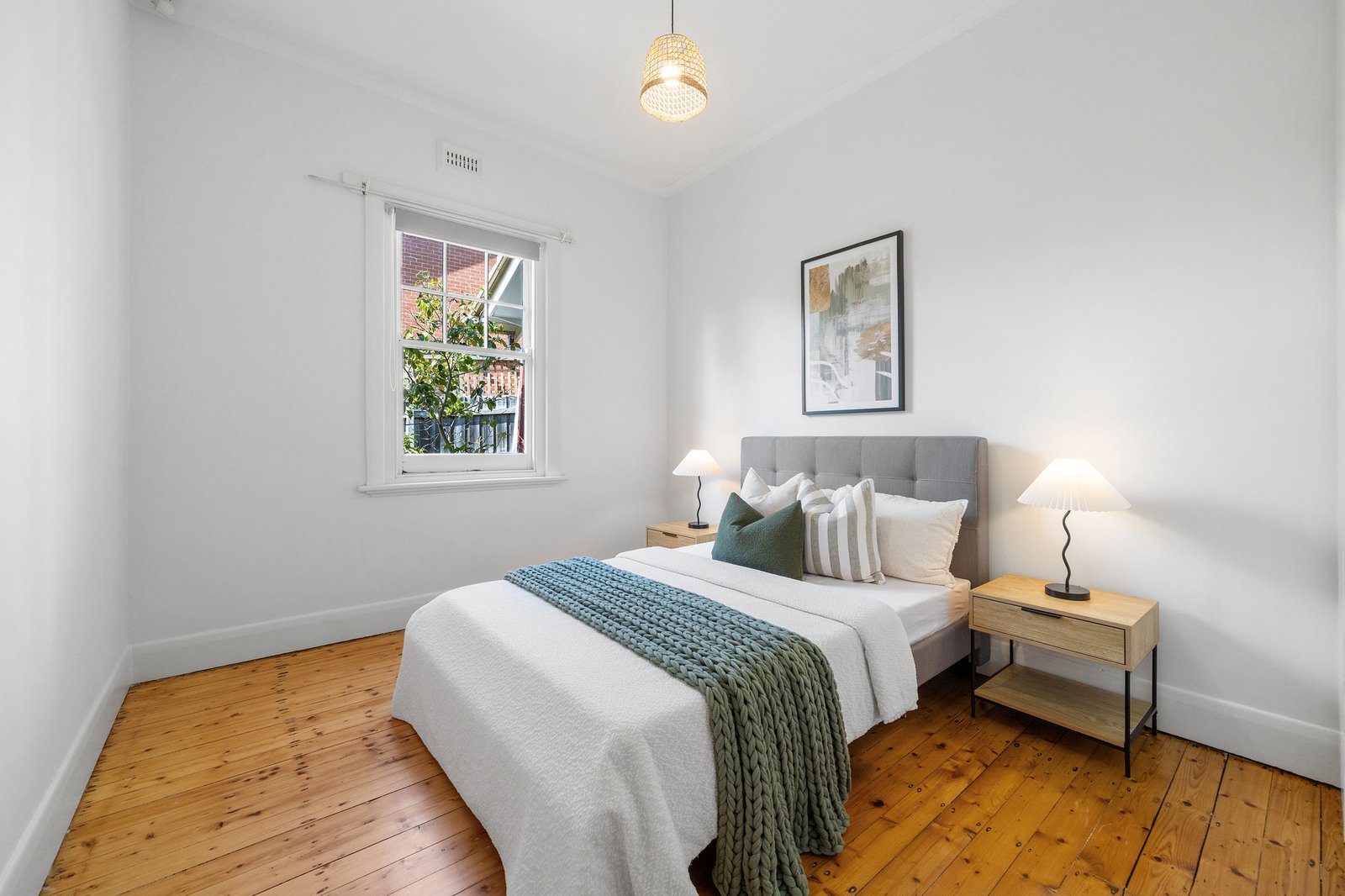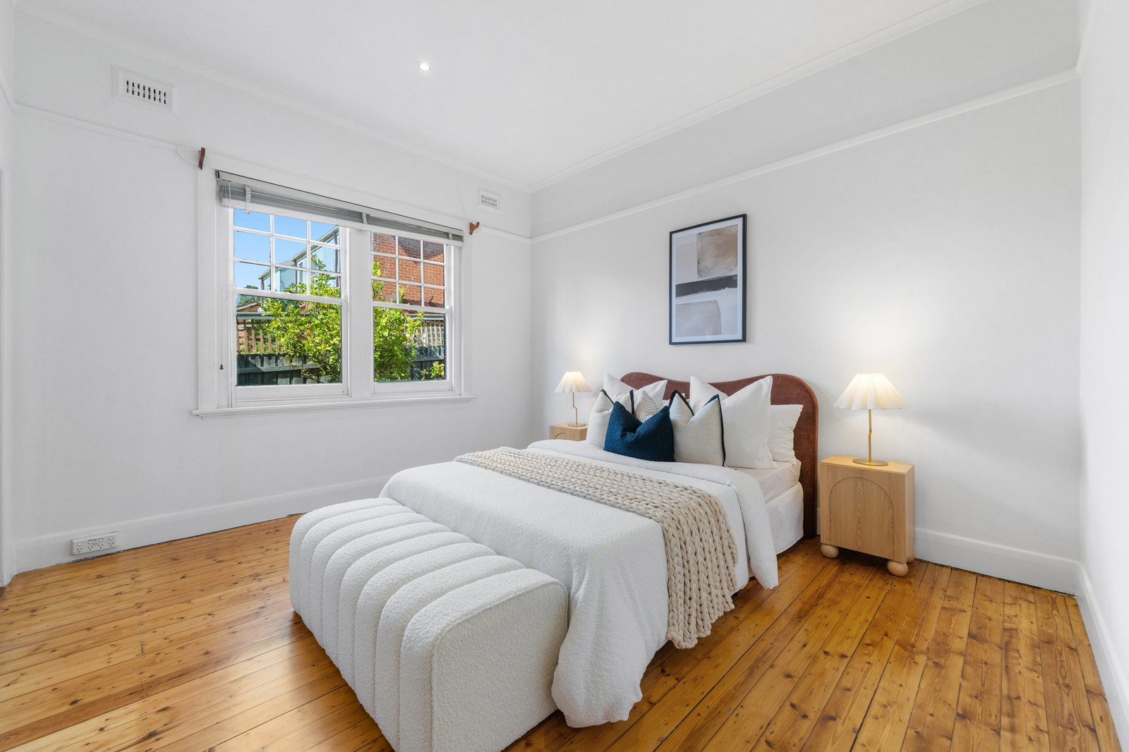 Accommodation comprises three well-proportioned bedrooms, each finished with timber flooring and neutral tones. The master bedroom enjoys a tranquil garden outlook and generous proportions, while the remaining bedrooms are bright and versatile, ideal for children, guests or a home office configuration. Built-in storage enhances practicality throughout.