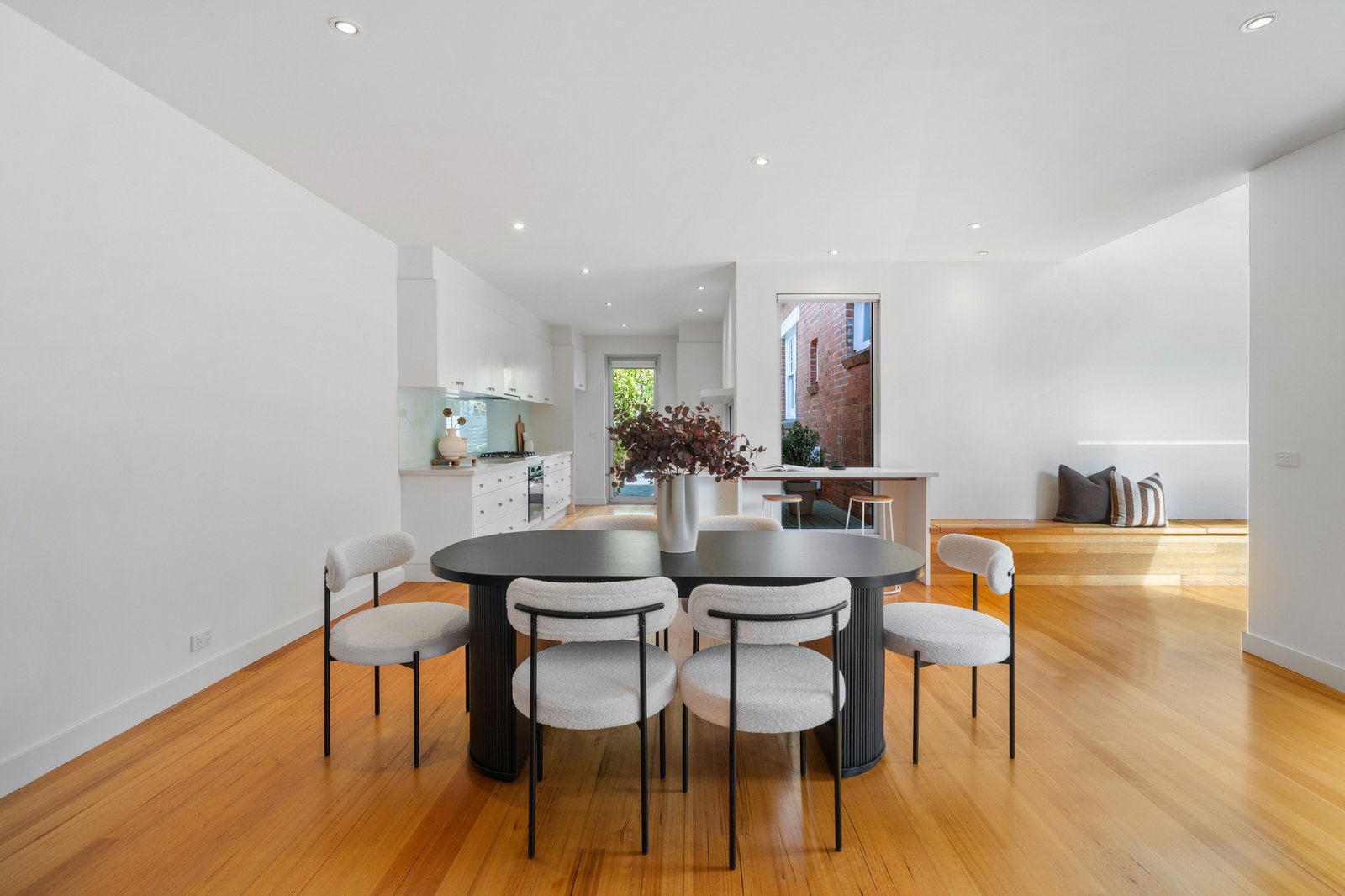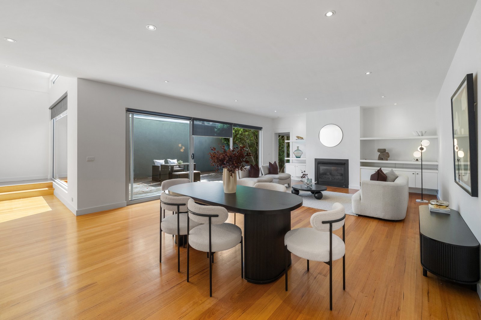 Positioned within one of Glen Iris’ most tightly held pockets, this beautifully presented brick home delivers effortless single-level living with a focus on light, flow and everyday comfort. Set behind a welcoming facade, the home unfolds into a generous open-plan living and dining zone where polished timber floorboards, crisp white walls and recessed lighting create a refined yet inviting atmosphere. A sleek built-in fireplace anchors the living space, while wide sliding doors extend the interior seamlessly to a private rear deck, enhancing the home’s strong indoor–outdoor connection.