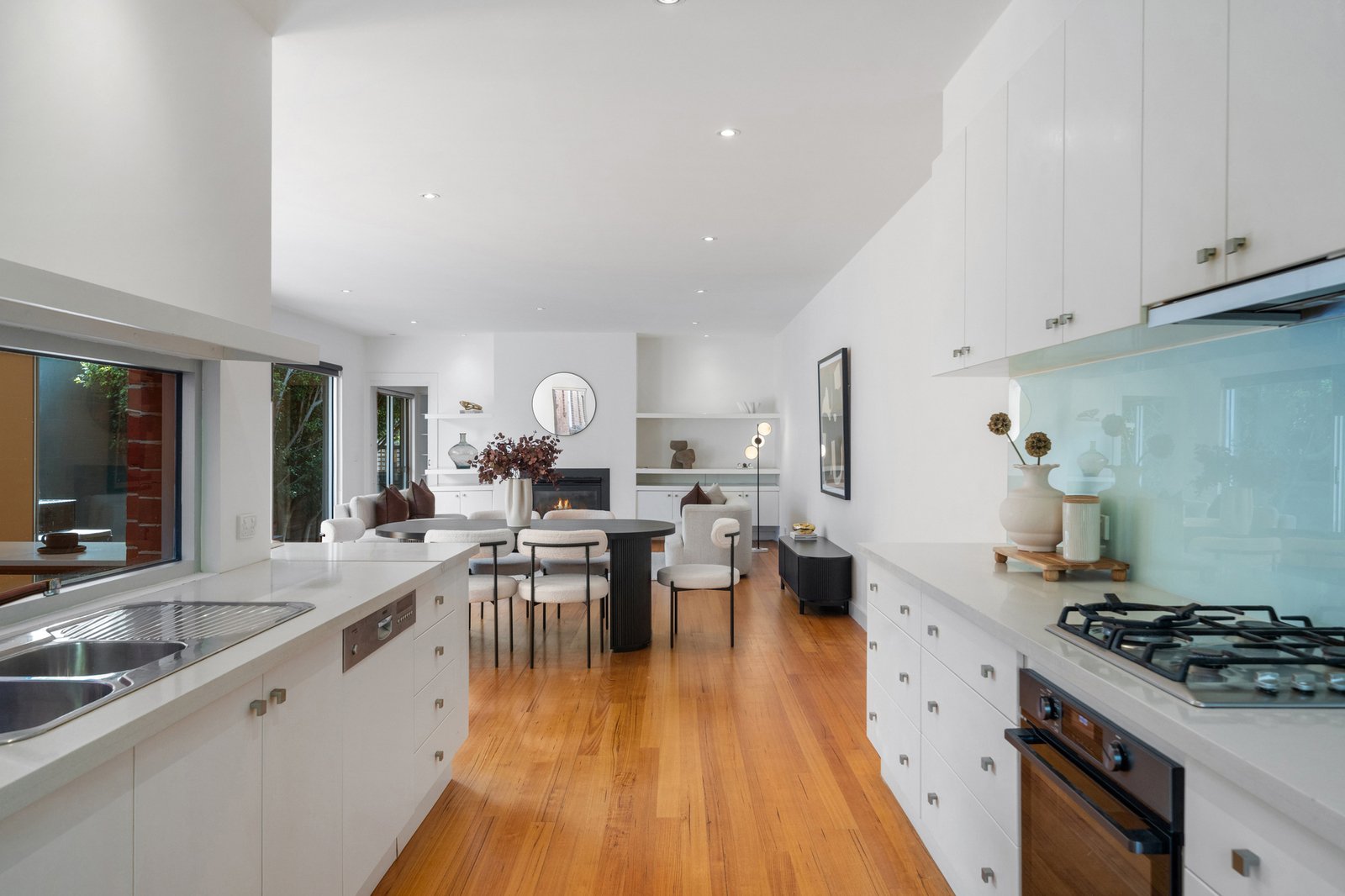 The kitchen is thoughtfully designed for both daily living and entertaining, featuring stone benchtops, streamlined white cabinetry and quality stainless steel appliances including a gas cooktop and wall oven. A breakfast bar peninsula provides a casual meals area and additional prep space, while the window above the sink invites natural light and garden outlooks into the heart of the home.