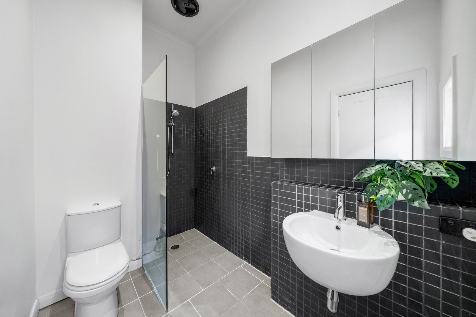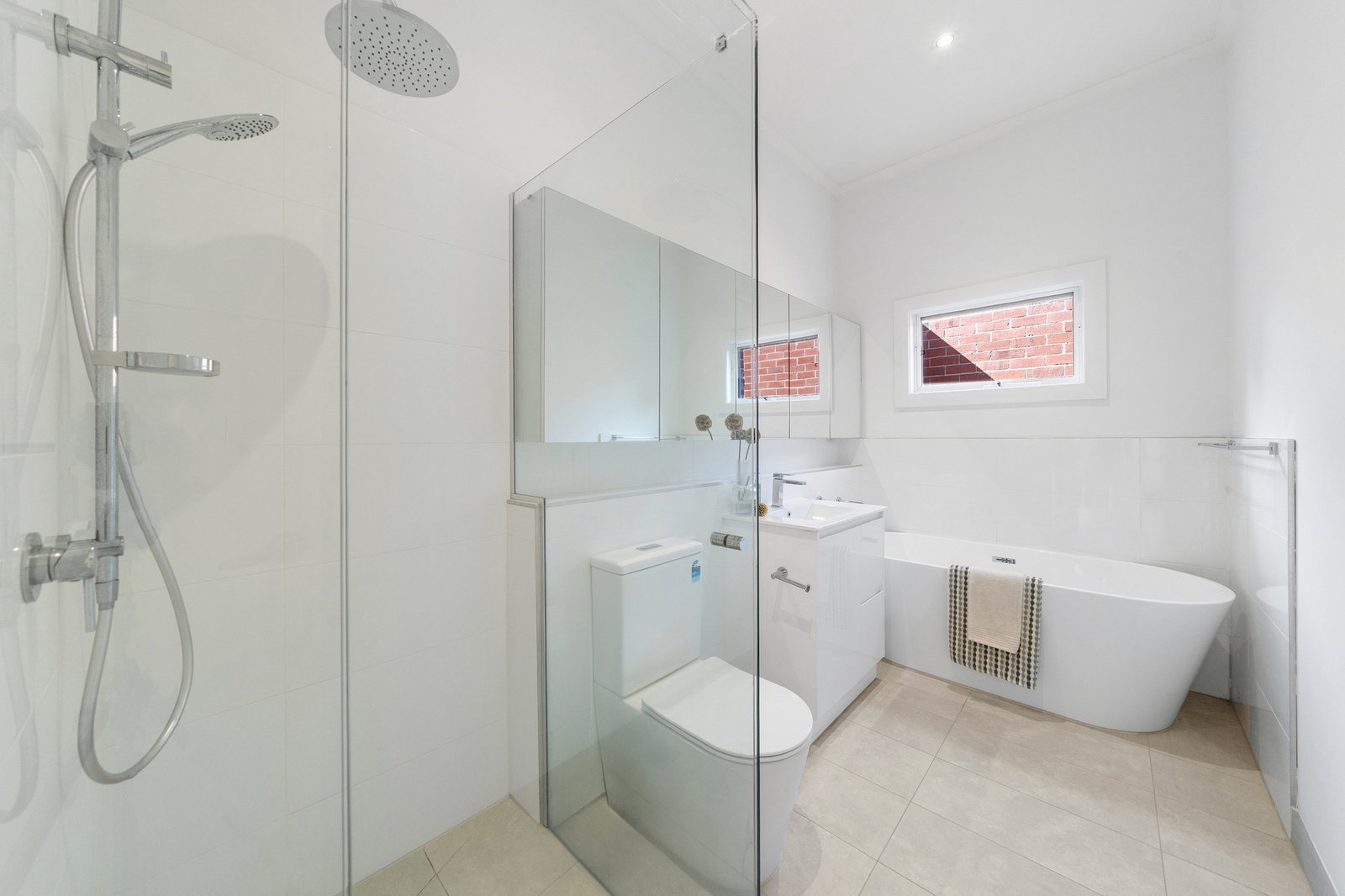 The main bathroom presents a contemporary aesthetic with stone floor tiles, a sleek vanity, frameless glass shower and a freestanding bathtub, offering both functionality and a sense of everyday luxury. A second bathroom complements the home with modern finishes, a walk-in shower and efficient layout to support family living.