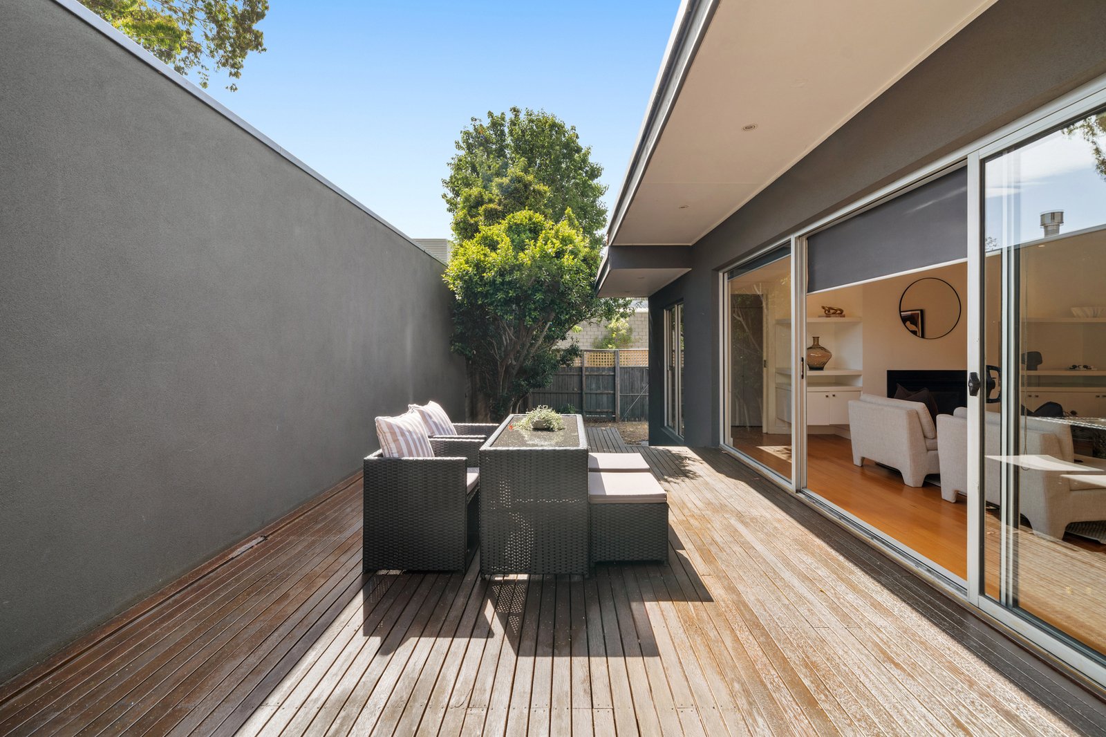A dedicated study or home office provides a quiet, light-filled workspace, ideal for remote work or study, thoughtfully positioned to ensure separation from the main living zones. Outdoors, the private rear courtyard is enhanced by timber decking, creating a low-maintenance alfresco setting perfect for relaxed entertaining, morning coffees or evening unwinding, all within an enclosed and private environment.