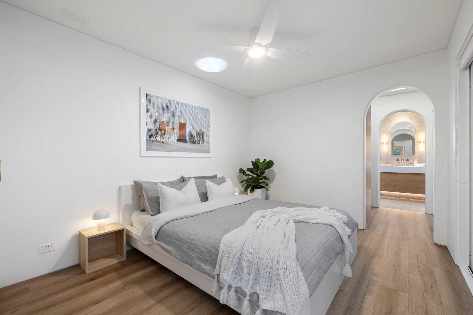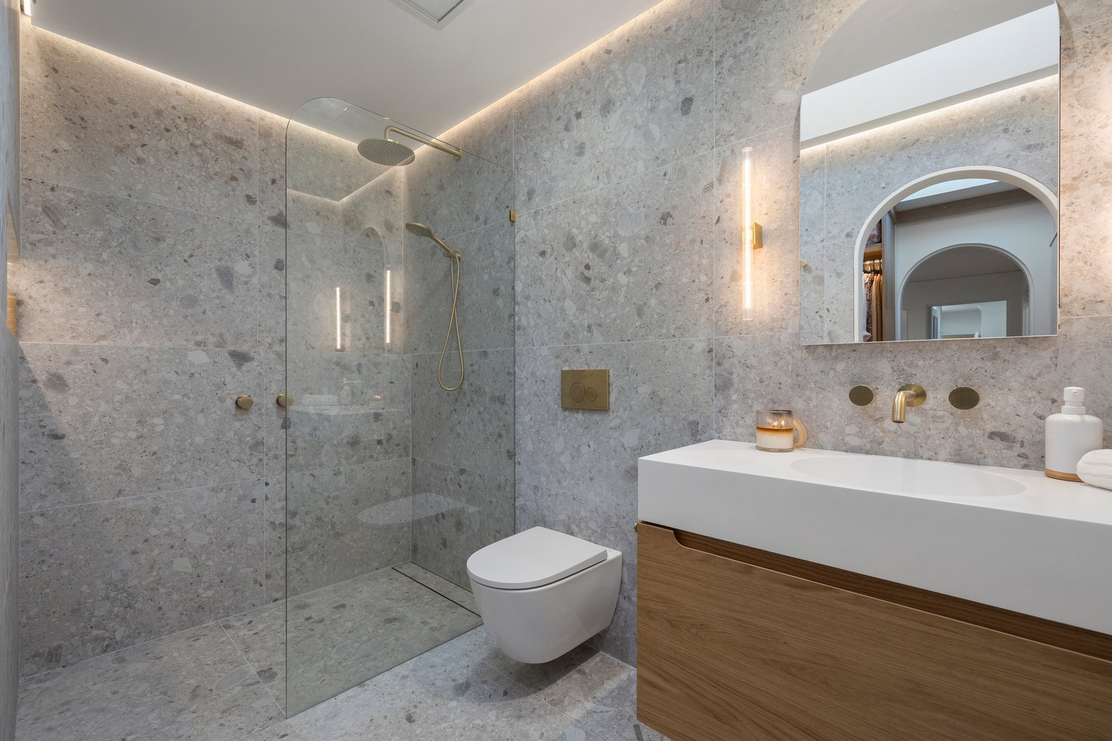 The newly renovated main suite is a glorious execution of contemporary luxury with nods to the fifties’ heritage. Boasting substantial fully-fitted wardrobing, it offers the most beautiful ensuite with brass fittings (dual shower), curved accents and gorgeous tiles all crowned beneath well-placed skylights.