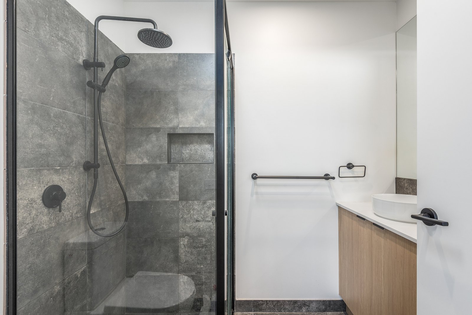 The main bedroom features walk-in robes and a tastefully presented ensuite with stone-topped vanity and chic black tapware. Bedroom two is separately zoned on the ground floor, featuring built-in robes, ensuite, and direct access to the rear courtyard.