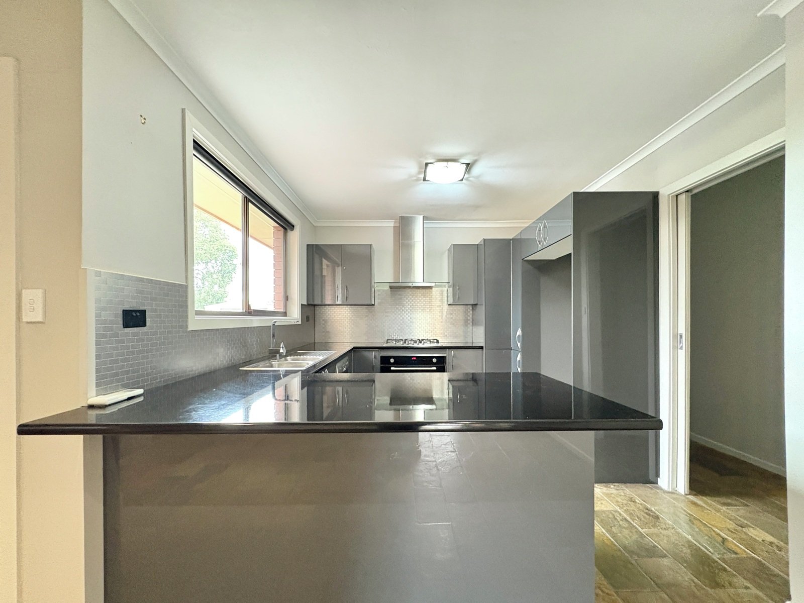 The U-shaped kitchen includes a cooktop, oven, dishwasher, and plenty of storage. It overlooks the open-plan living and dining area, which is fitted with a split system and opens via bi-fold doors to a covered alfresco space – great for outdoor dining or entertaining.