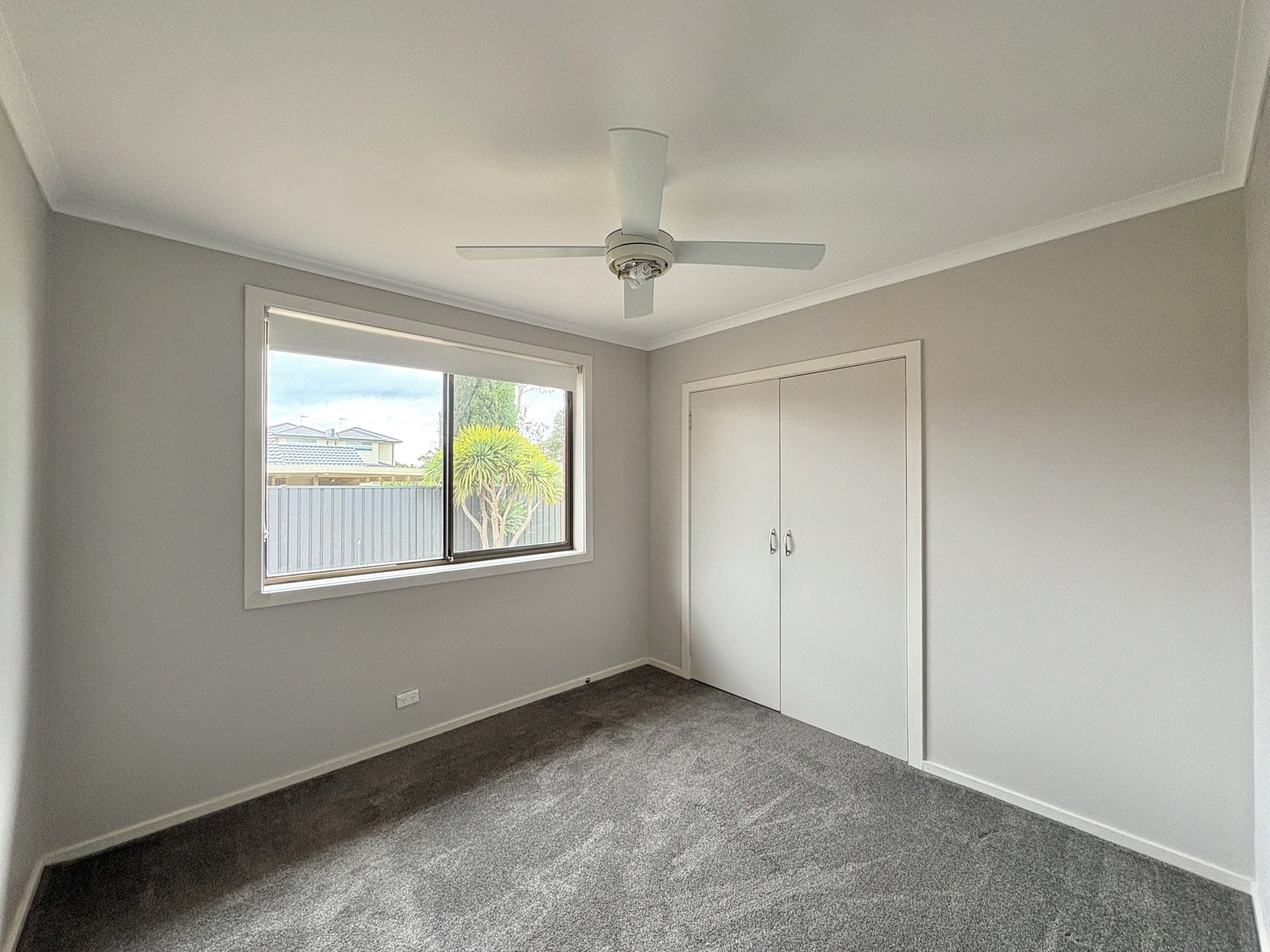 There are three well-sized bedrooms, all with built-in wardrobes and ceiling fans. The central bathroom has dual access from the master bedroom, and the separate laundry includes rear yard access.