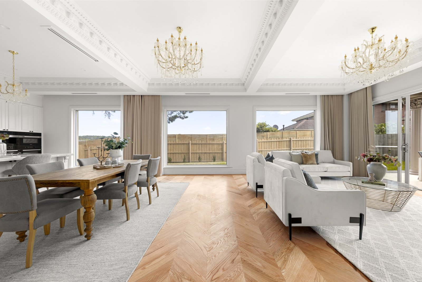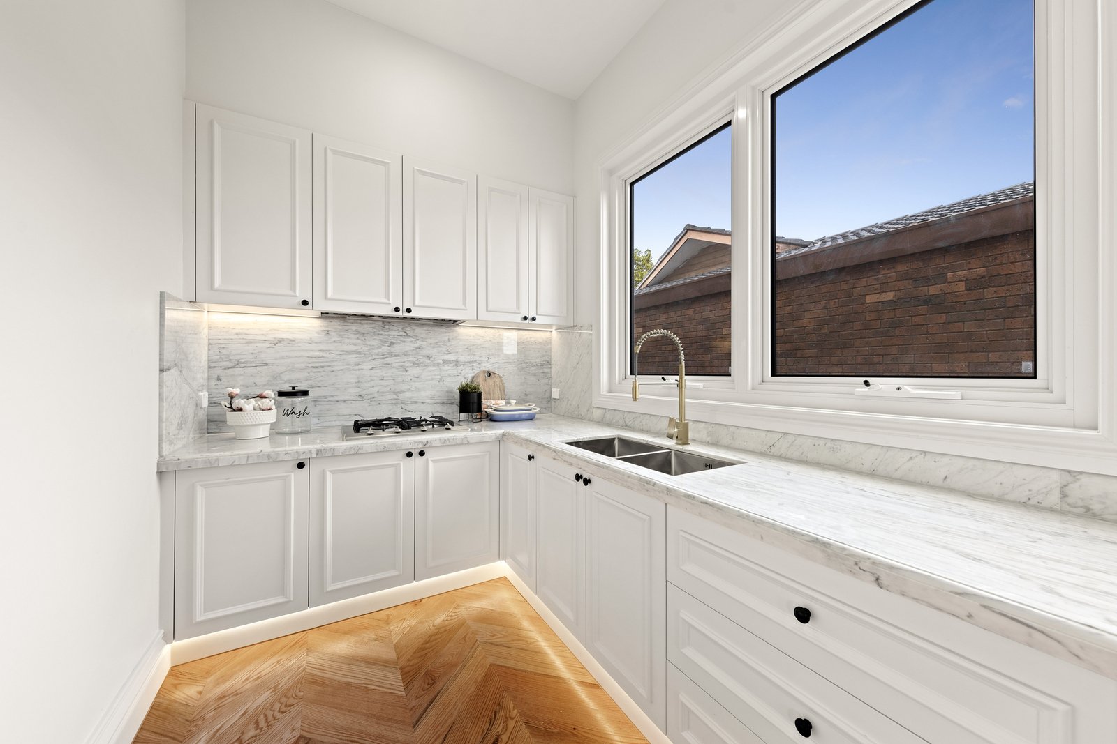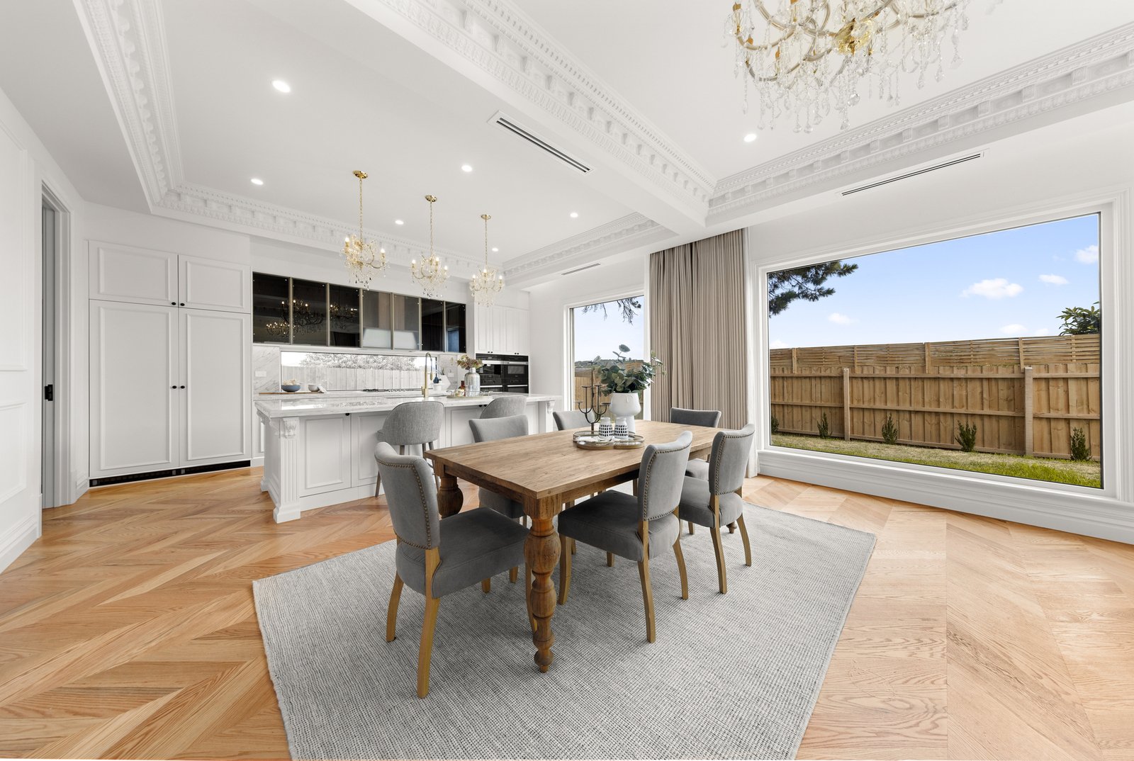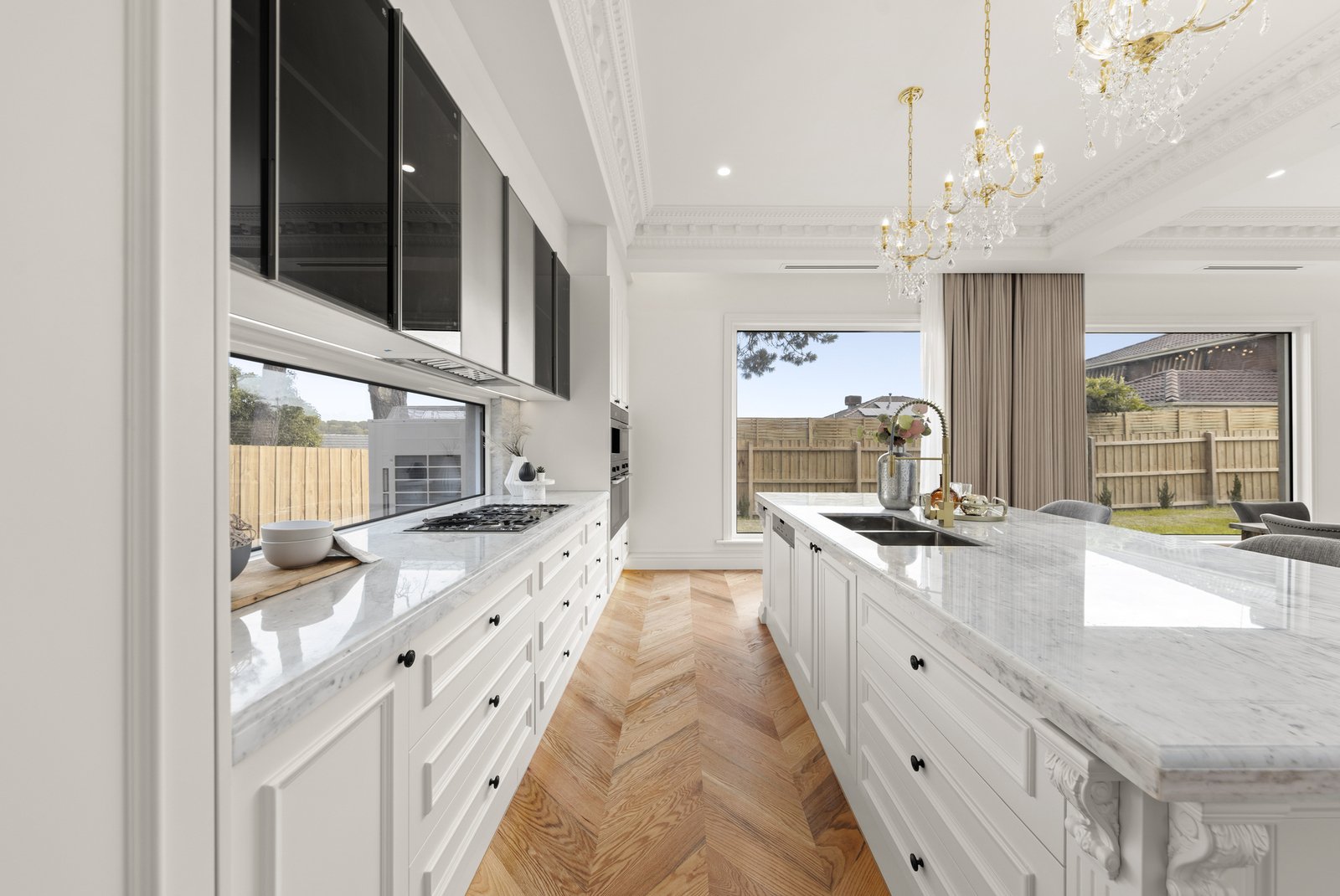 The interiors are anchored by the warmth and character of American oak herringbone parquetry flooring, bringing timeless elegance underfoot and setting a luxurious foundation for the home’s crisp palette and fine detailing. Every finish has been thoughtfully selected to feel cohesive, sophisticated and enduring, while the quality of workmanship is evident at every turn. At the centre of the home, the kitchen stands as a true showpiece—an entertainer’s dream and a chef’s domain—where striking natural marble makes a dramatic and elegant statement across benchtops and surfaces. A full suite of Miele appliances completes the experience, including dual ovens for effortless hosting, an integrated coffee machine for daily indulgence, and an integrated fridge and freezer for a seamless, streamlined aesthetic. The result is a kitchen that is as beautiful as it is functional, designed to impress guests yet perfectly suited to the rhythm of family life.