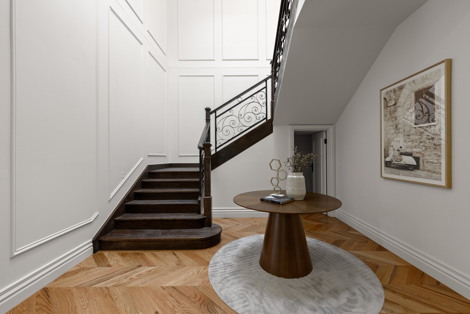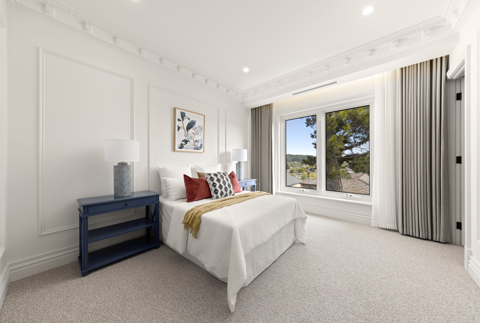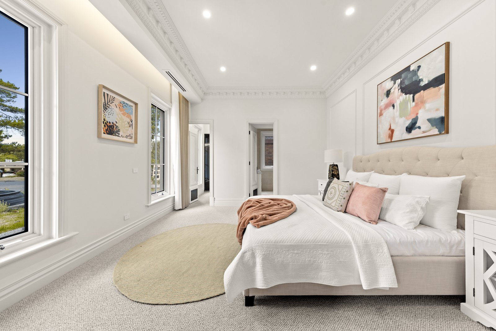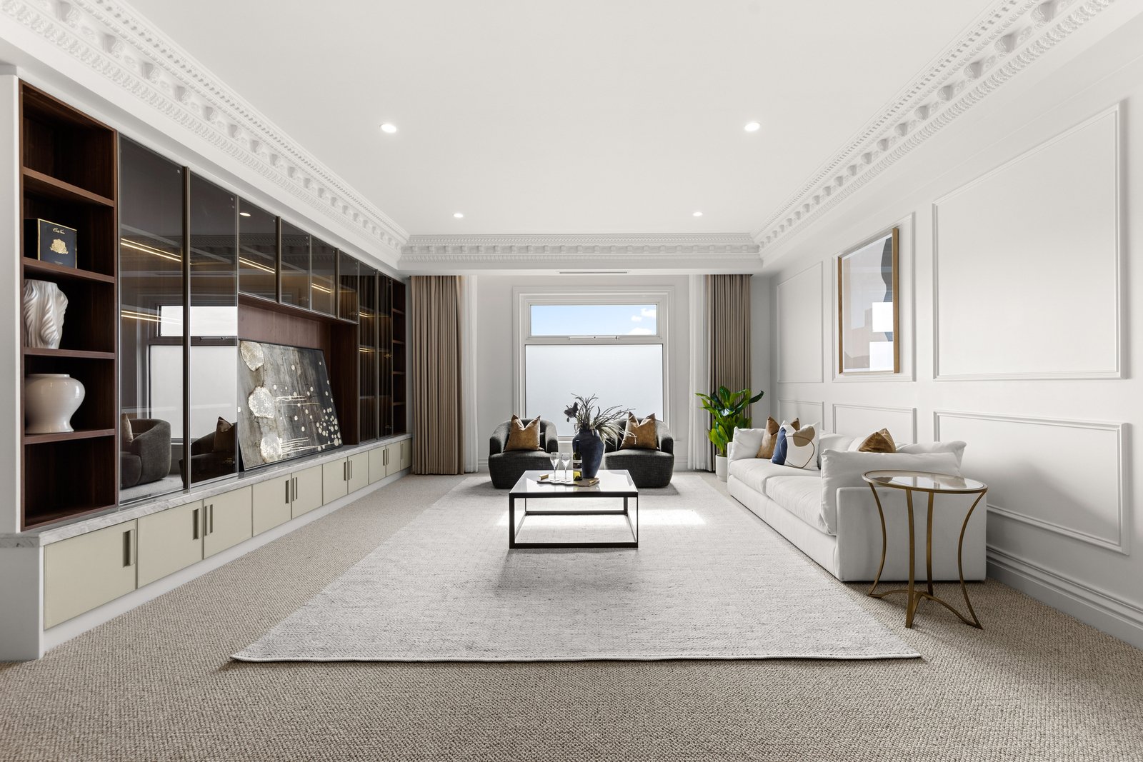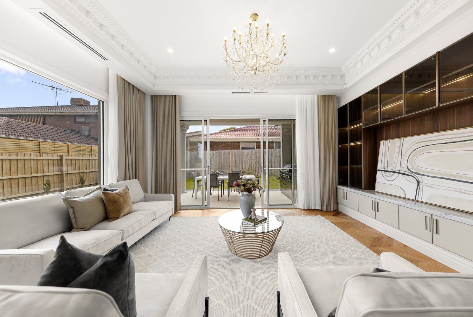 The interiors are anchored by the warmth and character of American oak herringbone parquetry flooring, bringing timeless elegance underfoot and setting a luxurious foundation for the home’s crisp palette and fine detailing. Every finish has been thoughtfully selected to feel cohesive, sophisticated and enduring, while the quality of workmanship is evident at every turn. At the centre of the home, the kitchen stands as a true showpiece—an entertainer’s dream and a chef’s domain—where striking natural marble makes a dramatic and elegant statement across benchtops and surfaces. A full suite of Miele appliances completes the experience, including dual ovens for effortless hosting, an integrated coffee machine for daily indulgence, and an integrated fridge and freezer for a seamless, streamlined aesthetic. The result is a kitchen that is as beautiful as it is functional, designed to impress guests yet perfectly suited to the rhythm of family life.