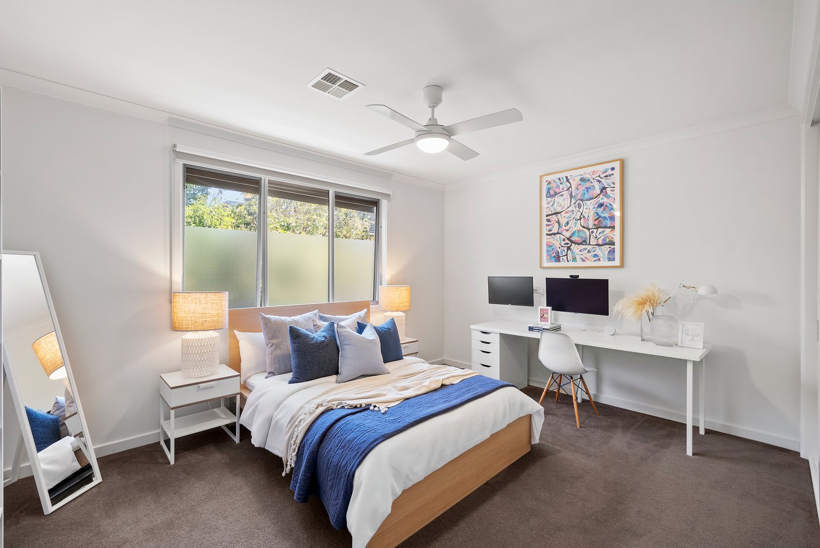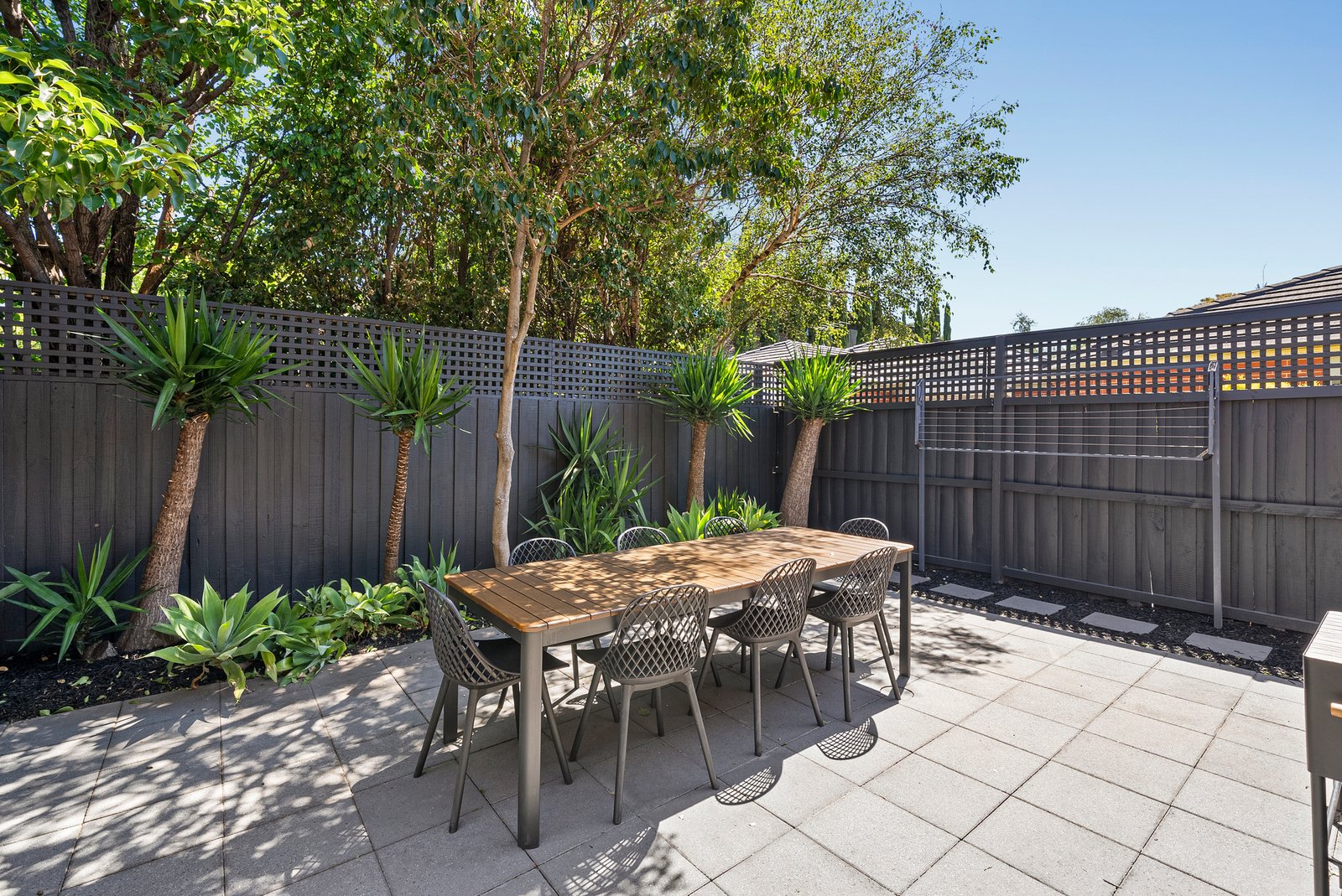 Designed for everyday comfort and effortless entertaining, the heart of the home is an expansive open-plan living and dining domain filled with natural light and complemented by warm timber flooring. Large sliding doors create a seamless transition to the private courtyard, extending the living space outdoors and making entertaining easy year-round. The sleek kitchen anchors the space with stone benchtops, a substantial island and breakfast bar seating, generous storage and quality appliances including gas cooking, all positioned to overlook the main living area. Heating and cooling ensure year-round comfort, while thoughtful inclusions such as a secure garage with internal access, separate laundry and additional bathroom enhance everyday functionality.