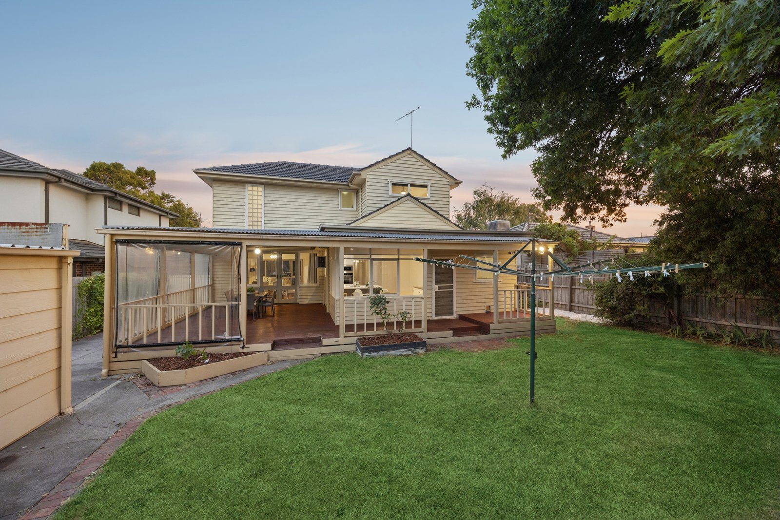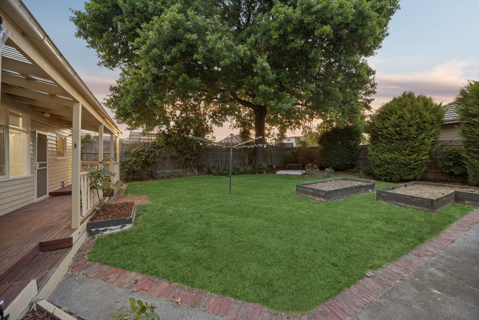 Outdoors, the property truly excels, offering a huge covered pergola with decking overlooking a private backyard filled with lush lawns, established trees and vegetable gardens an ideal setting for entertaining, children’s play and relaxed family living. Parking is well catered for with a single garage and additional off-street parking.