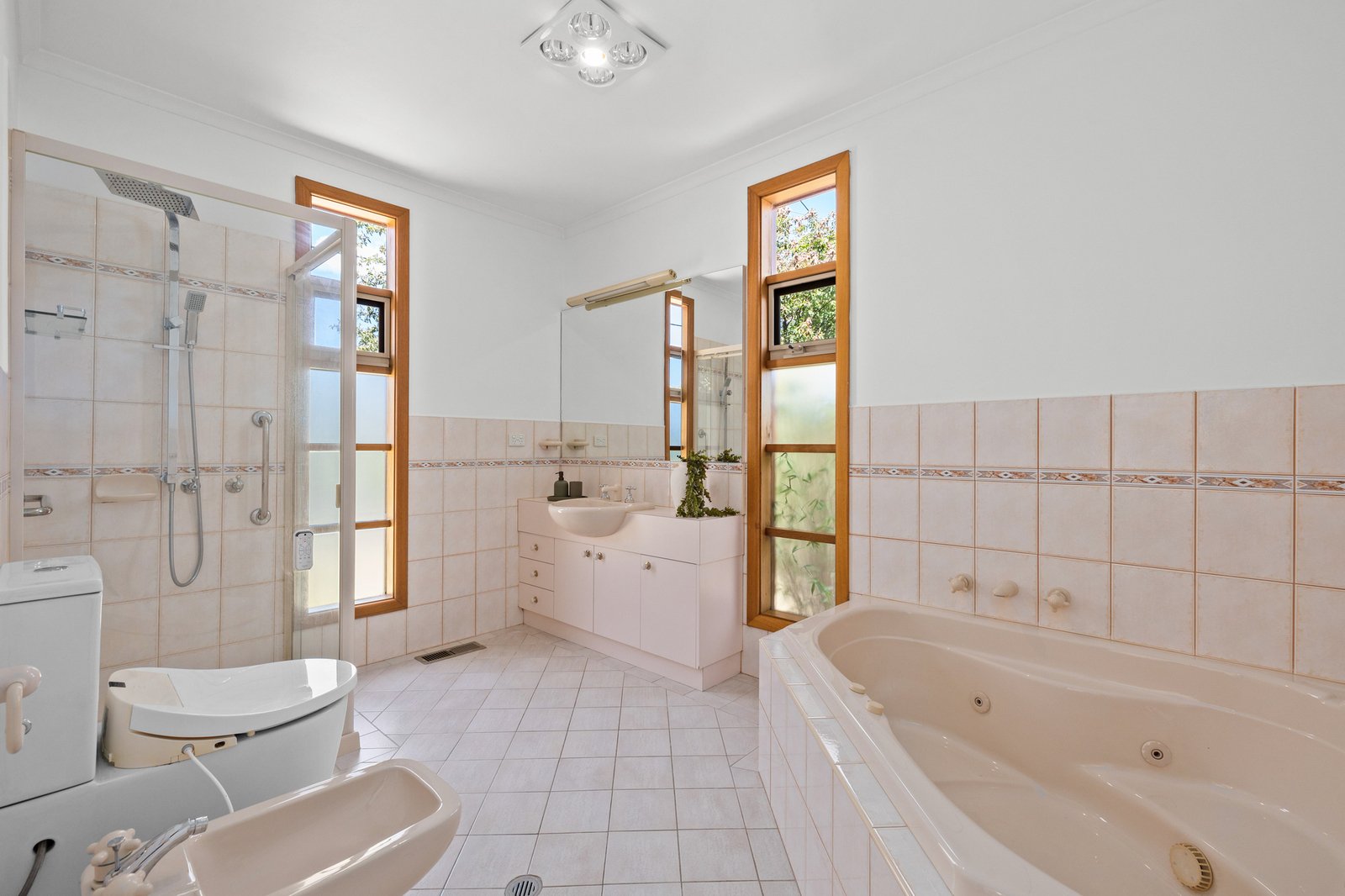Views of the garden are also enjoyed from the downstairs main bedroom which is an impressive retreat offering a walk-in wardrobe plus a full ensuite boasting a corner spa bath and bidet. A second bedroom with mirrored robes is also on the lower level serviced by an adjacent bathroom, while two more spacious doubles (BIRs) are tucked upstairs sharing yet another bright bathroom.