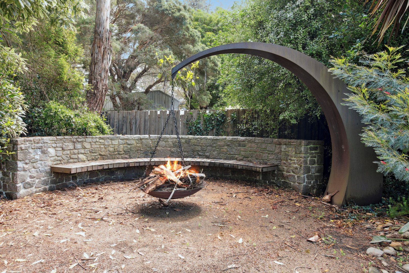 - The backyard has been designed to enjoy year-round entertaining with a sleek fire pit/sitting area.