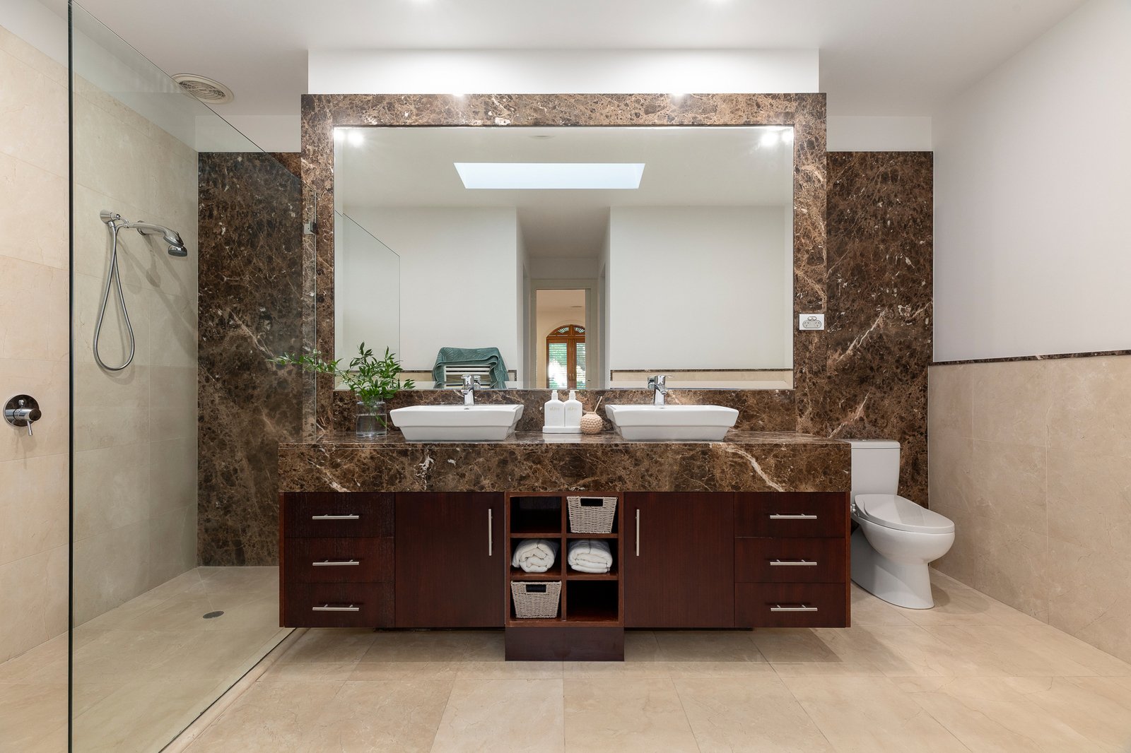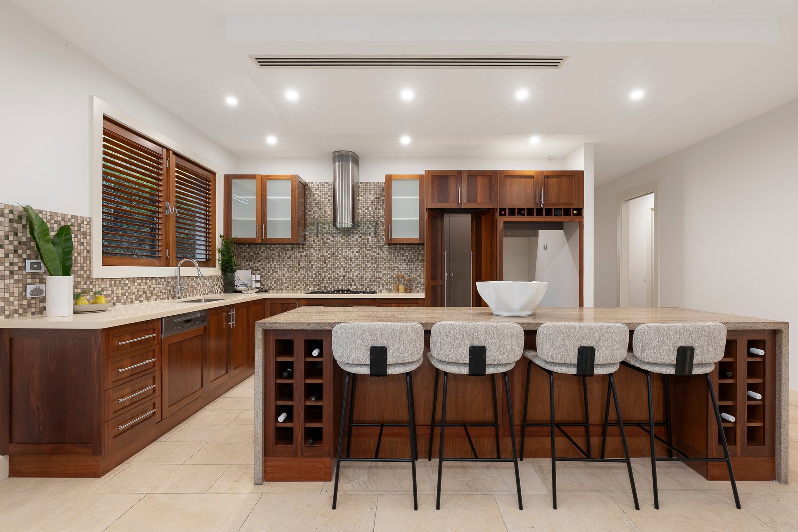 A travertine tiled foyer with wrought-iron chandelier beckons guests inside to accommodation that includes a formal lounge with gas log fireplace, an open plan living/dining zone and an impeccably appointed gourmet kitchen where quality Miele appliances, a waterfall-edge island and hidden butler-style pantry are all highlights.