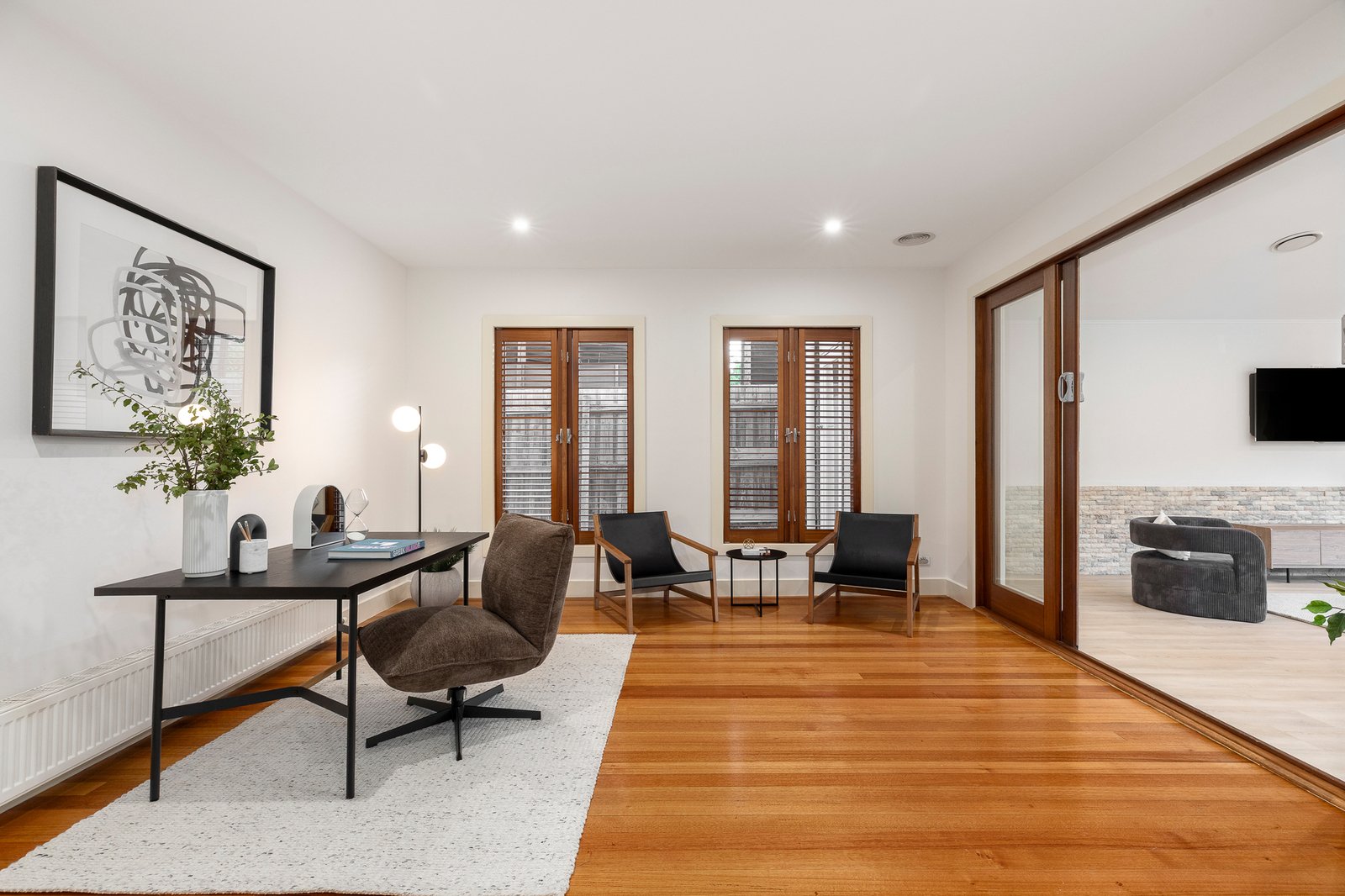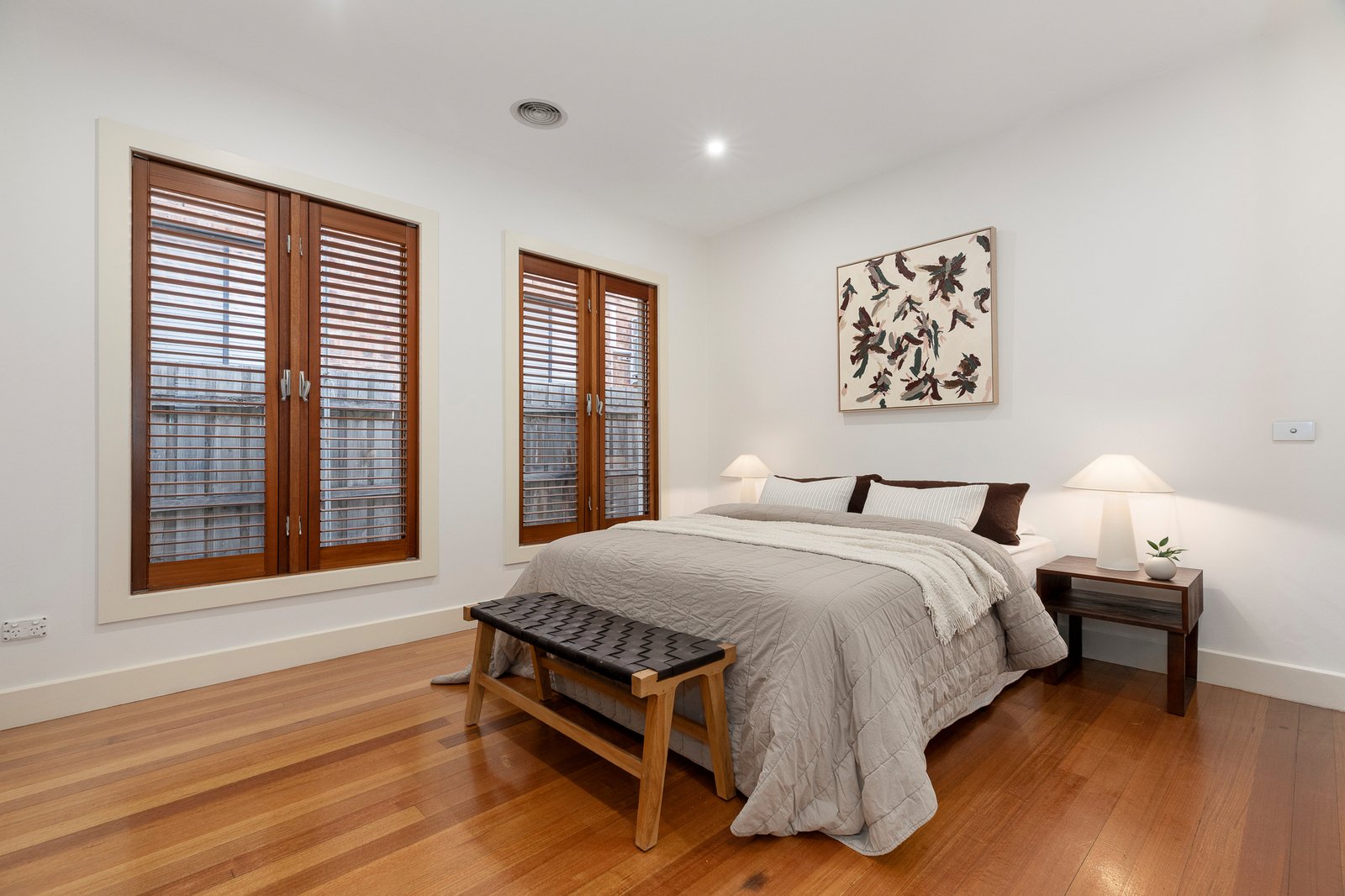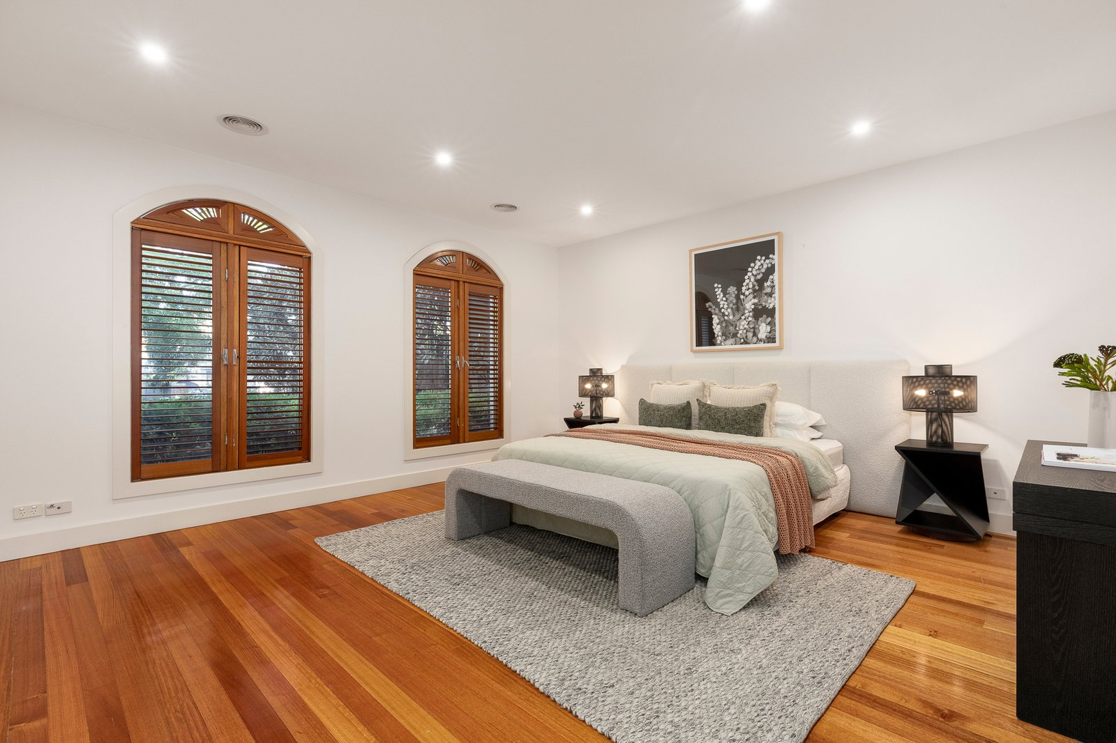 The home has four bedrooms in total, including the peacefully positioned primary bedroom which looks out across the front garden and includes a hotel-like ensuite and walk-in robe. The remaining bedrooms all boast built-in storage and share a luxe family bathroom with double-sized shower and bath along with a separate WC.