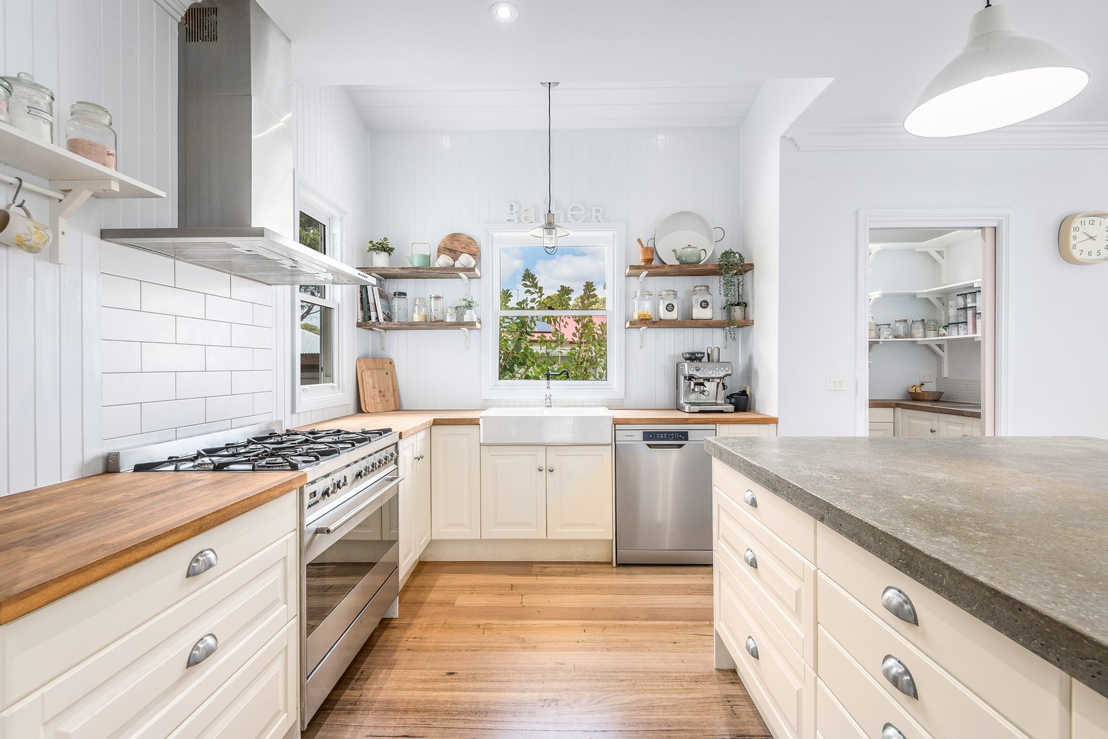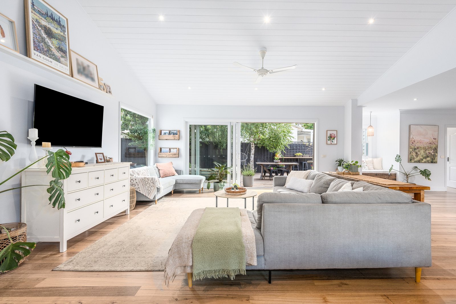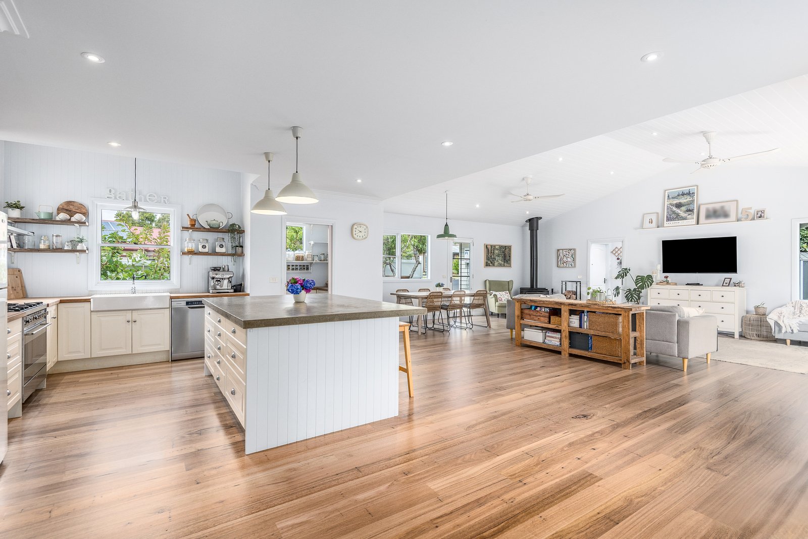 To the rear, the open plan kitchen, dining and living area is expansive, with a north facing aspect for warm natural light, and timber lined vaulted ceilings enhancing the sense of space throughout. The stunning entertainer’s kitchen features a large central island with concrete benchtop, chic pendant lighting, 900mm Smeg oven and cooktop, rangehood, dishwasher, double butler’s sink, classic cabinetry and a butler’s pantry with second sink and a reverse Osmosis filtered water tap. The spacious dining and living area is well designed for everyday living and impressive entertaining, with a cosy reading nook by the woodfire heater and a built in window seat - the perfect spot to put your feet up and relax. Glass stacker doors create an effortless connection with the outdoor entertaining area, ideal for hosting large gatherings of family and friends.