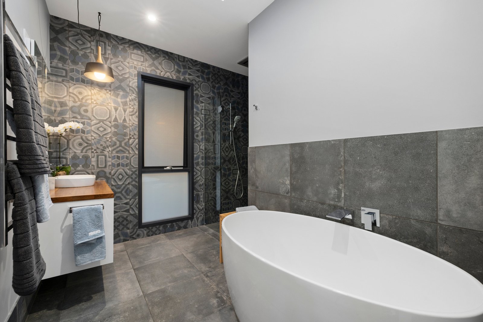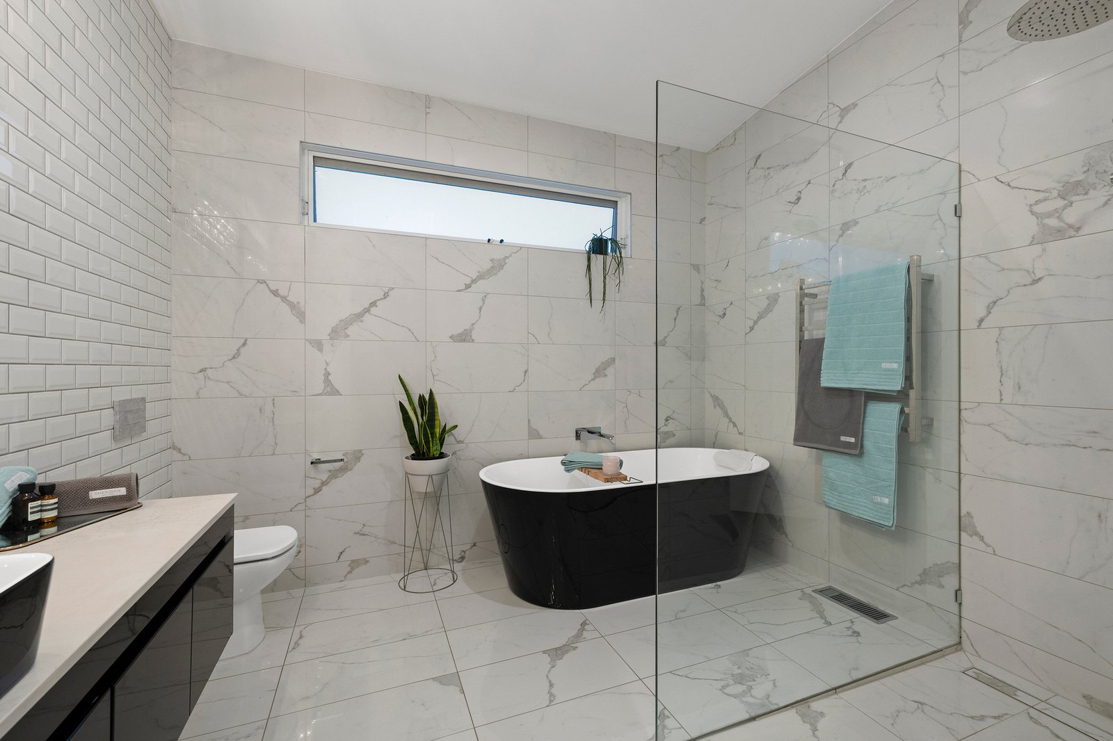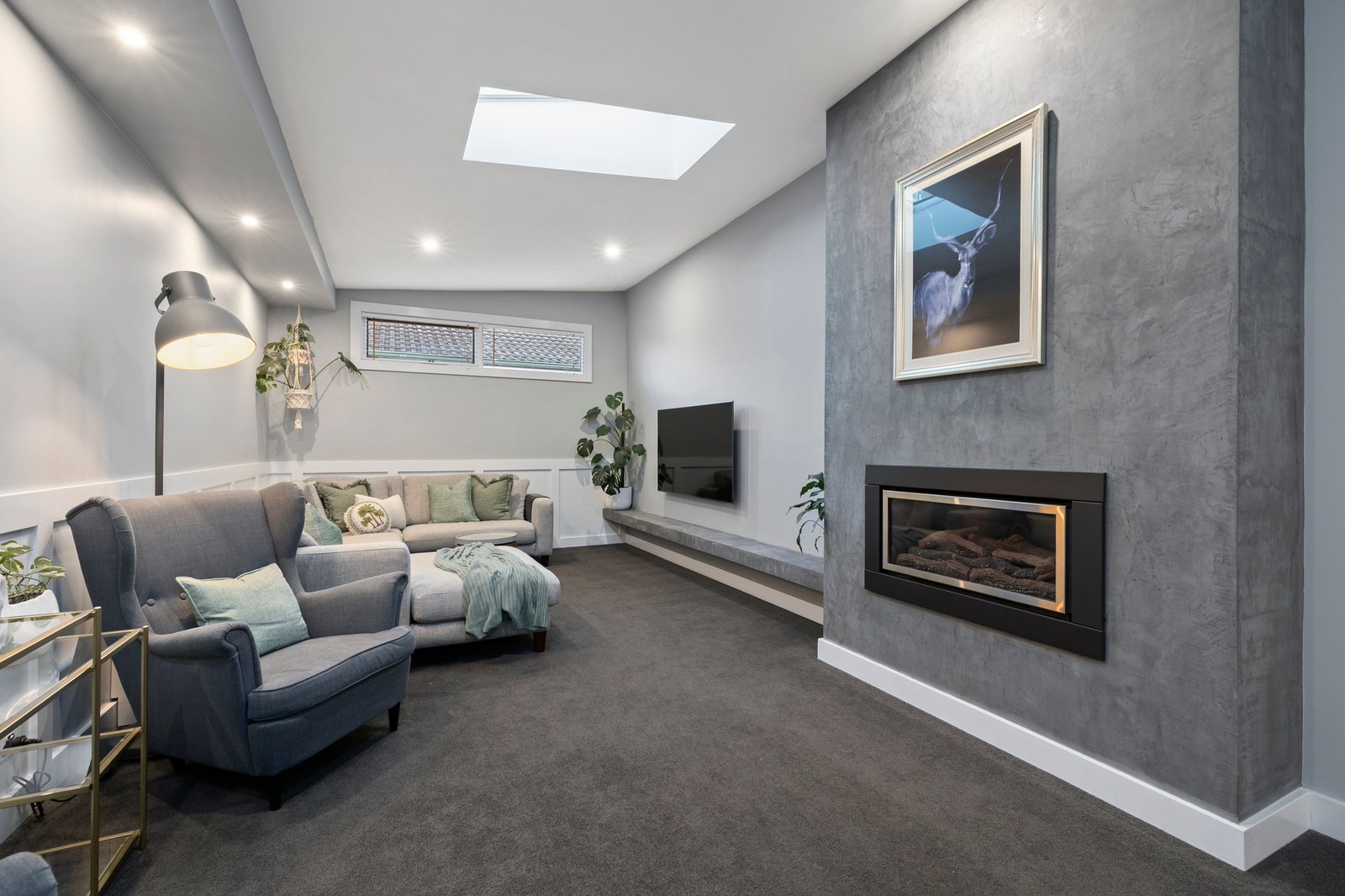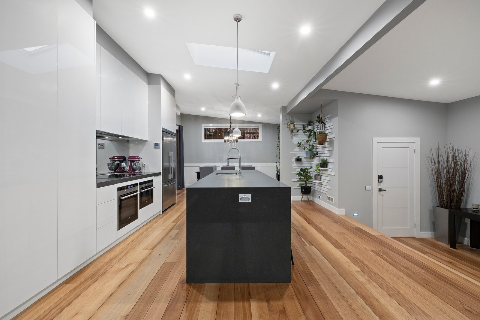 Zoned for parental peace and privacy with a vast master-suite encompassing a luxe ensuite and a corridor of robes, there’s perfect family harmony with kids zoned in their own rear wing around the quiet lounge, and easy work/life balance with dual workstations for the fitted home-office. Up to the minute with fully-tiled designer bathrooms (the main with a freestanding bath against a retro-inspired feature-wall), the home features rich Rose Gum hardwood floors, premium stone benchtops and architectural extras including a Venetian-polished fireplace surround and extended floating hearth.