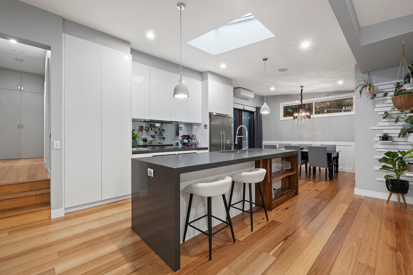 Take your beachside lifestyle to the next level with an outstanding mid-century renovation and a Beaumaris-border location. Retaining the spirit of its mid-century origins, this elevated four bedroom plus home office, two bathroom design is reimagined in light-filled split-level style with separate spaces to lounge and dine around an elite Siemens appliance kitchen (with induction cooktop and integrated microwave), a quiet place for kids to hide away in a soaring skylit lounge, and endless entertaining in a fan-cooled al fresco zone.