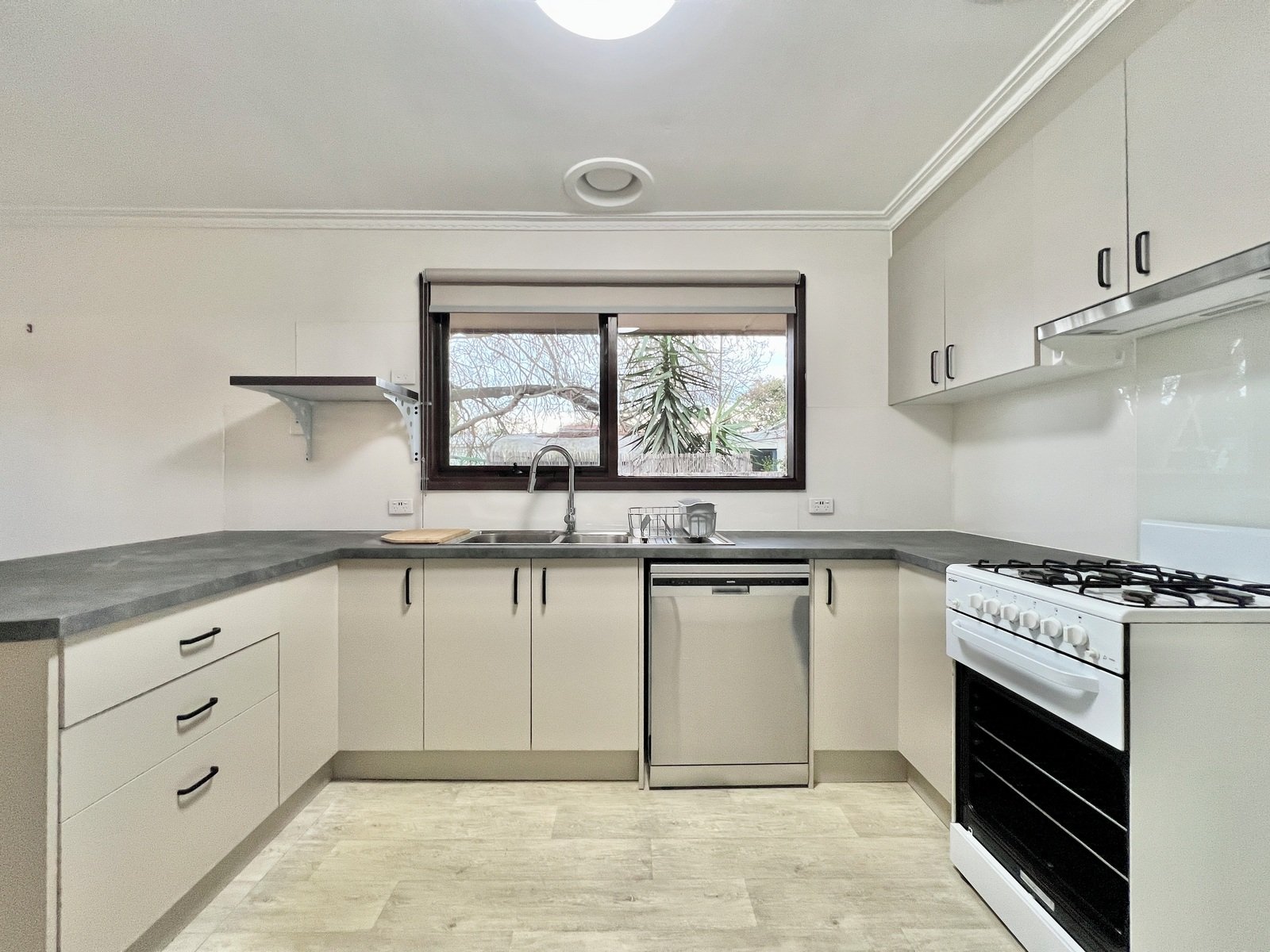 On entry, fresh light interiors create a welcoming ambience within. The main living area is positioned off the entrance and offers a spacious area to relax or entertain, complete with split system heating and cooling and an additional gas heater. This area flows effortlessly into the adjoining kitchen and meals area. The kitchen has been recently updated with brand new benchtops, dishwasher and free standing oven and cooktop with excellent storage.