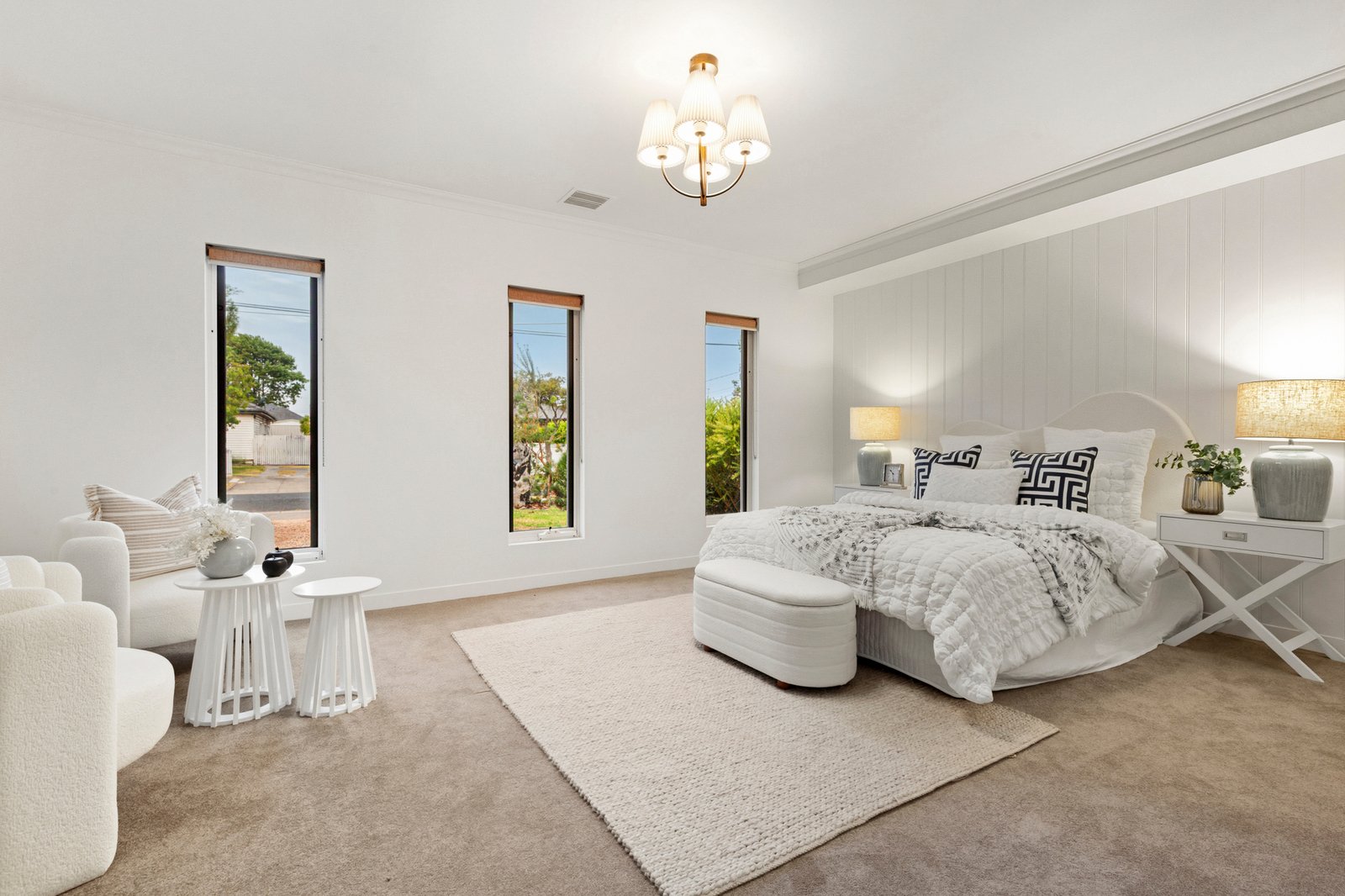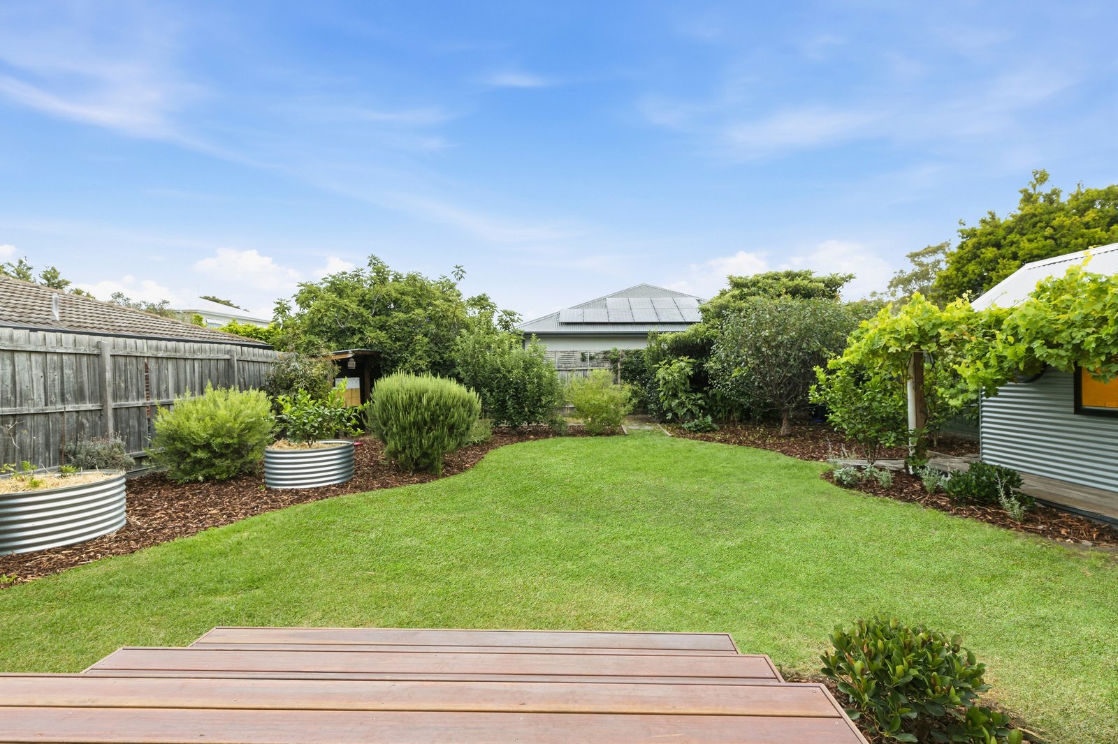 Family accommodation is thoughtfully arranged, with the main suite and second bedroom positioned toward the front of the home, and two additional bedrooms at the rear alongside a bright and airy study zone. Mirrored robes and a deluxe family bathroom with deep soaking bath complete the interior, while a charming vine-covered multi-purpose room in the backyard is ideal for work or play.