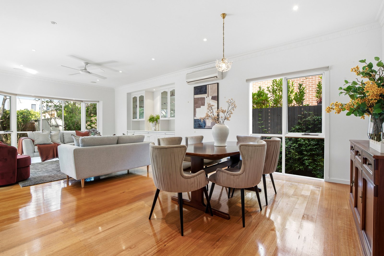 A dedicated study adds valuable functionality on the ground floor, while the upper level hosts three generous bedrooms with built-in robes and a family bathroom. The main bedroom enjoys the added benefit of its own ensuite with heat light. Brick veneer construction is enhanced by high ceilings, polished floorboards, bay windows and green outlooks throughout, alongside ducted heating, air conditioning, custom joinery, a large laundry, powder room and ample driveway parking.