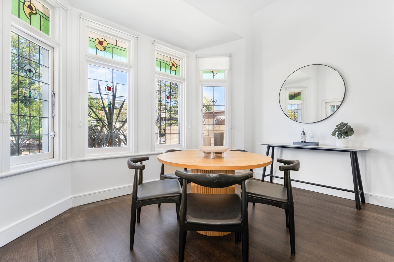 Stretching out under soaring ceilings, the inspired two-level layout accentuates space without sacrificing natural light. Discover a family dining space neatly nestled under lead-lit bay windows, underscored by a stone-finished kitchen showcasing a waterfall-edged breakfast bar, soft-closing cabinetry, and the full suite of premium Smeg appliances including a dishwasher and a 4-burner gas cooktop.