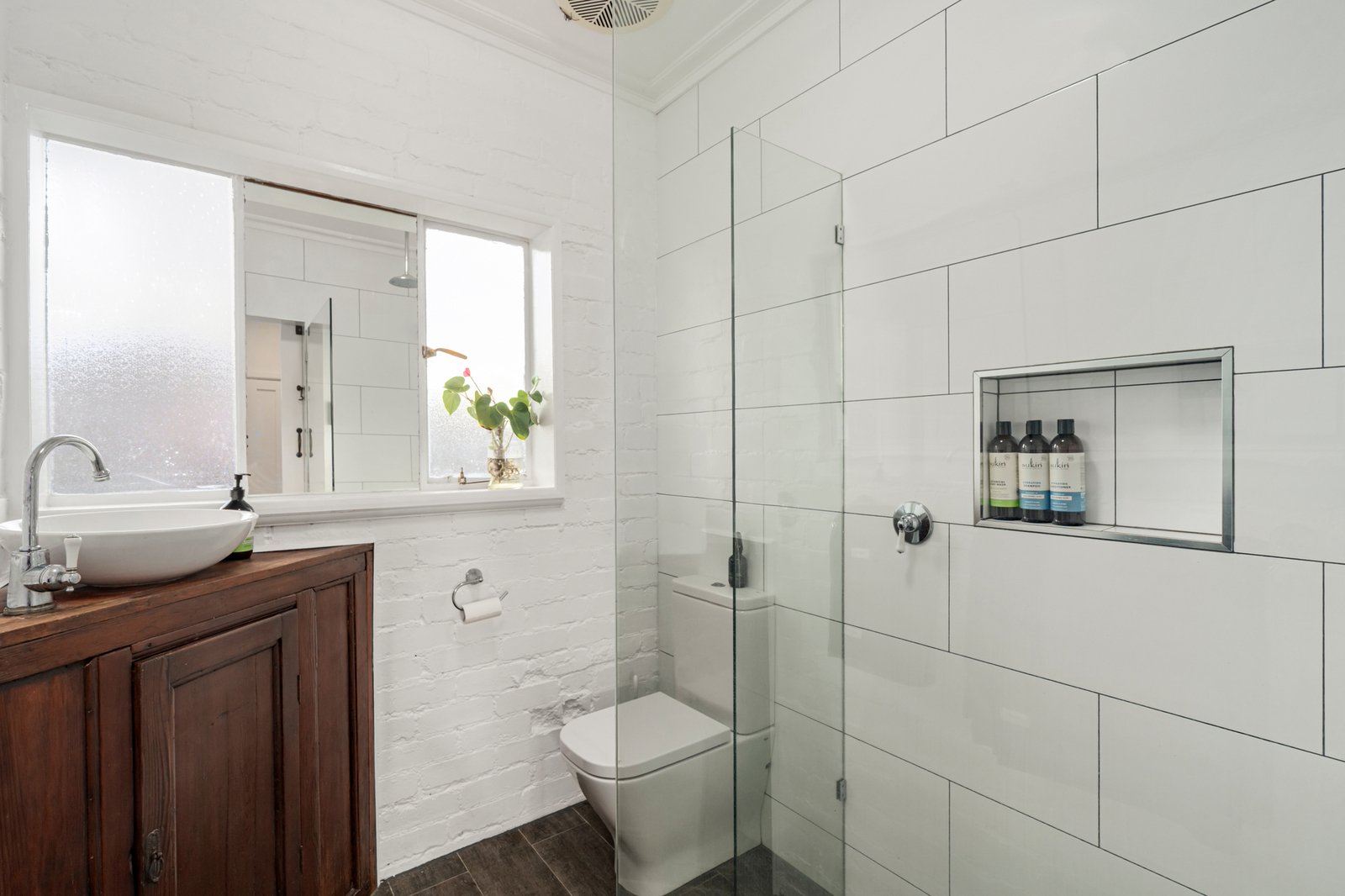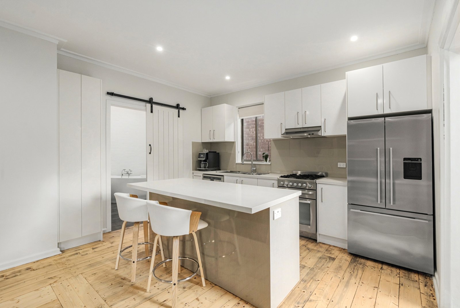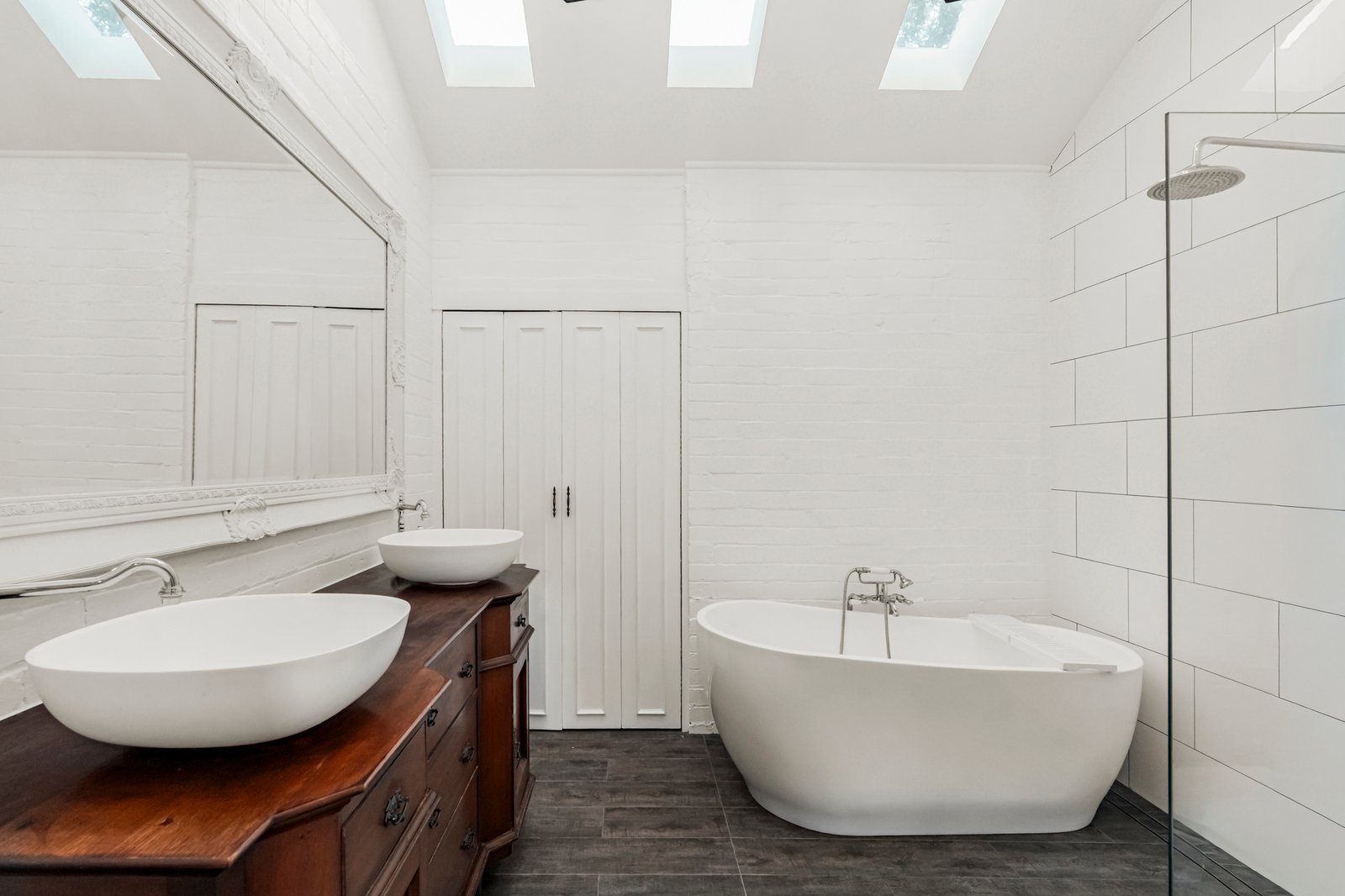 Accommodation comprises 3 generously sized bedrooms, all fitted with built-in robes. The main bathroom is a standout feature, finished with floor-to-ceiling tiling, skylights for natural light, a large bath, walk-in shower, dual basins and distinctive cabinetry, all complemented by a feature barn door. The second bathroom is equally well finished with floor-to-ceiling tiles, a walk-in shower with niche, single vanity, WC and ample storage. Additional storage is provided via an attic space of approximately 15 square metres.