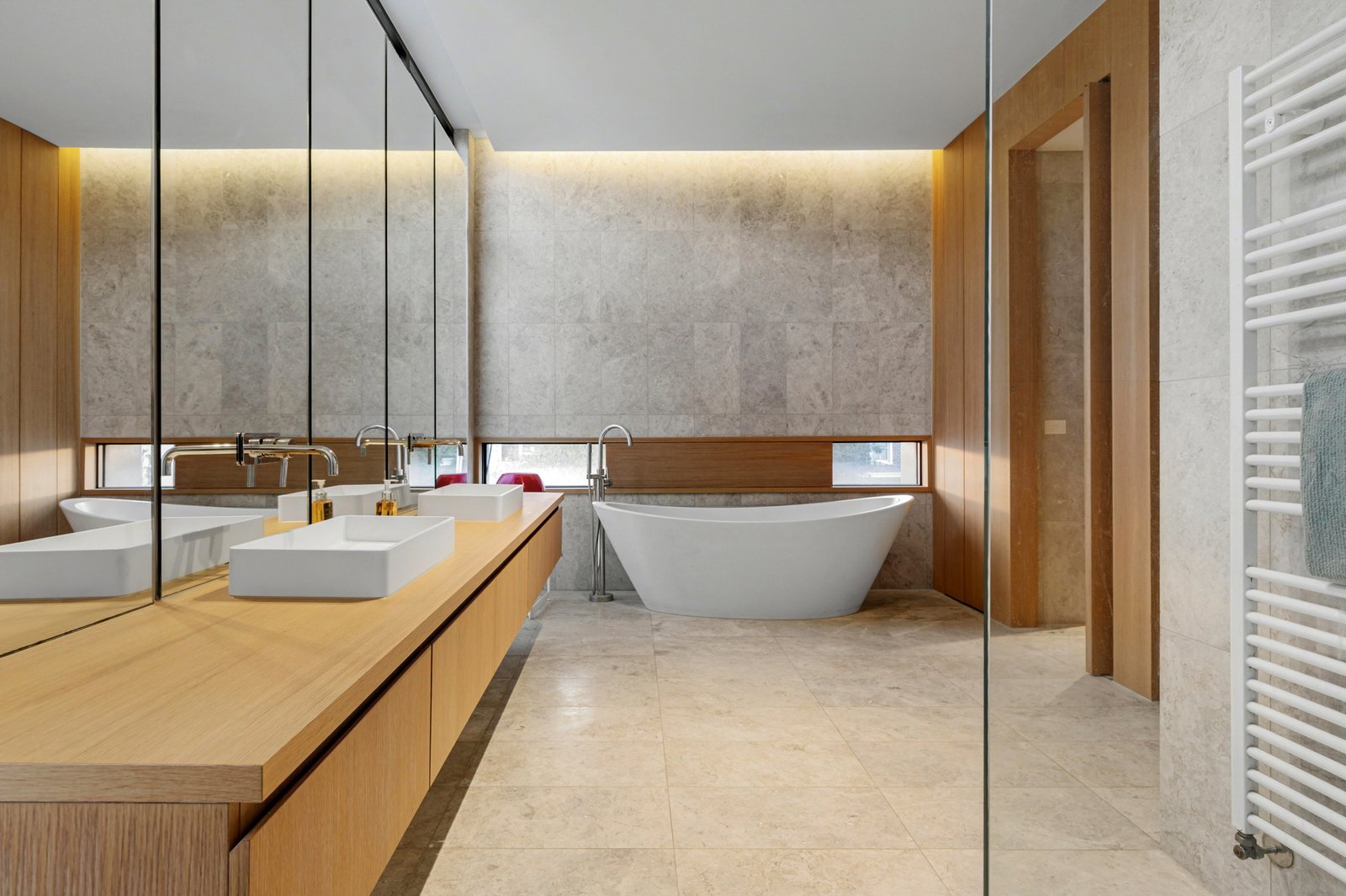 The upper floor is headlined by an indulgent main bedroom suite of sought after scale and serenity. Floor-to-ceiling glazing captures treetop outlooks and sunset skies, while separate his and hers walk-in dressing rooms introduce a rare level of privacy and practicality. The hotel-inspired ensuite is conceived as a luxurious retreat, featuring a bespoke dual vanity and a freestanding ovoid bath.