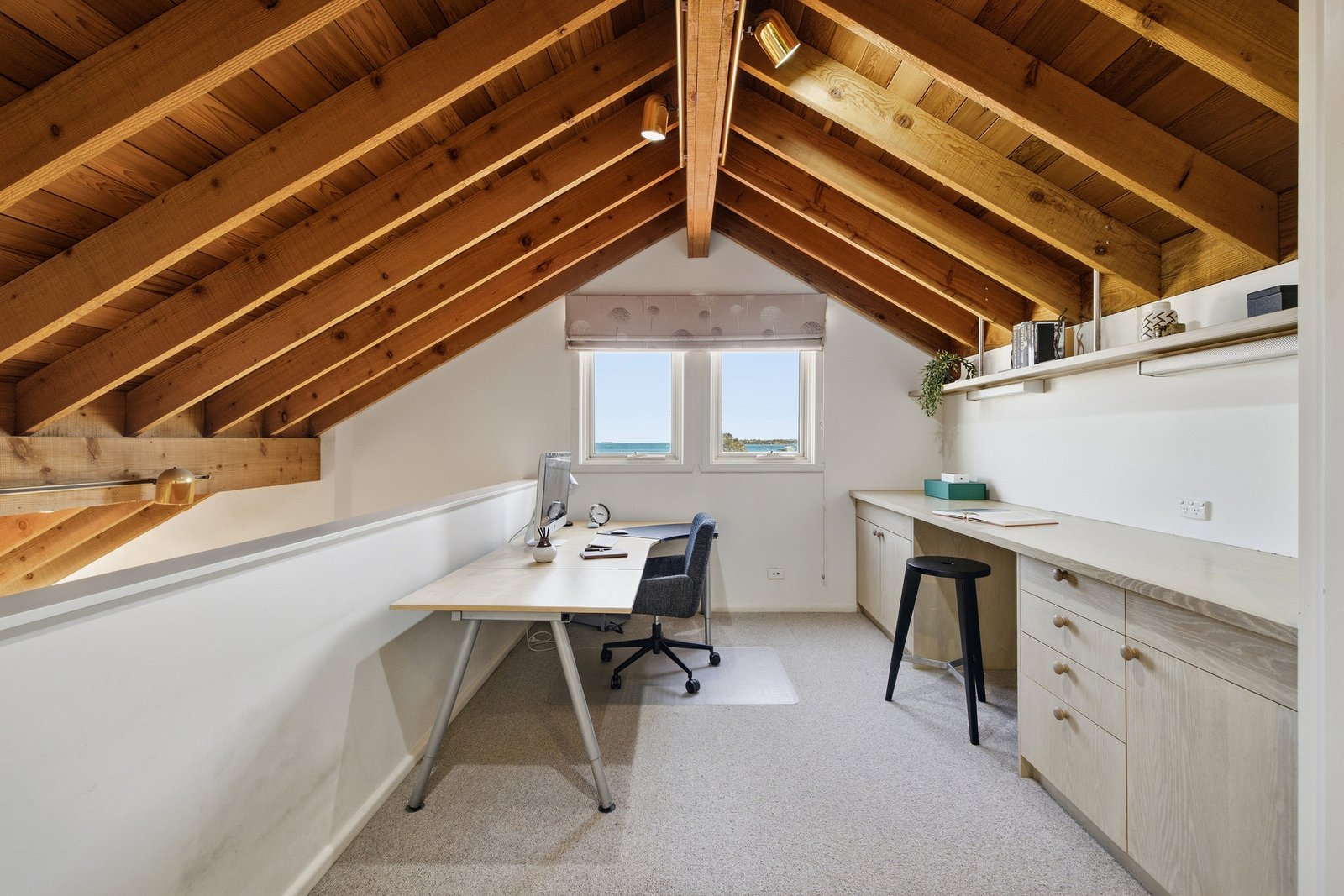 Claiming Parkdale's highest point in soaring style, this four bedroom plus home-office, four bathroom, dual-suite architect design elevates all expectations with the substance of full-brick, suspended-slab, commercial construction...and the soaring style of glass and timber cathedral ceilings, a lofty mezzanine space, walls of feature glazing and unparallelled views from the Dandenongs to the Peninsula.
