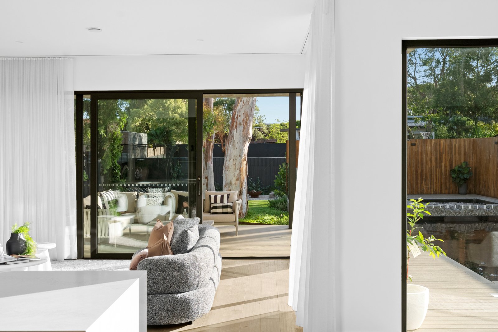 Substantial living and separate dining domains are softened by delicate sheers and framed green outlooks, while the living zone is anchored by a broad statement fireplace and expansive stacker sliding doors opening to the outdoors.