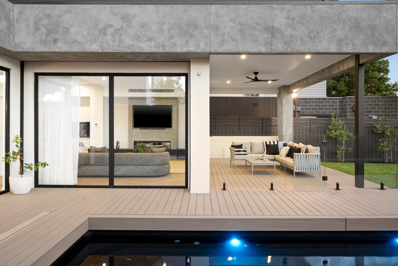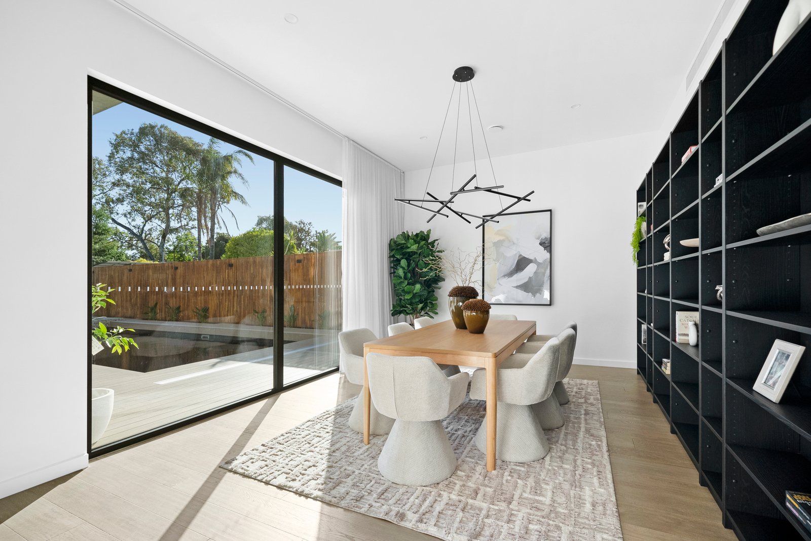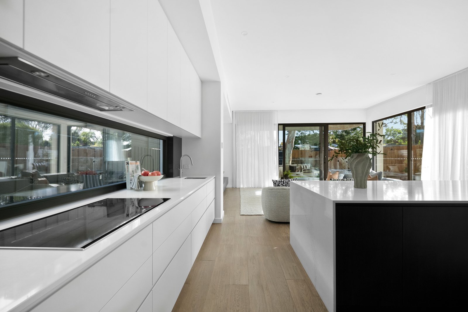A wide hallway draws the eye toward the rear where family living takes centre stage. Expanses of glazing form near-continuous walls of glass, flooding the interior with natural light and creating a seamless visual connection with the landscape.