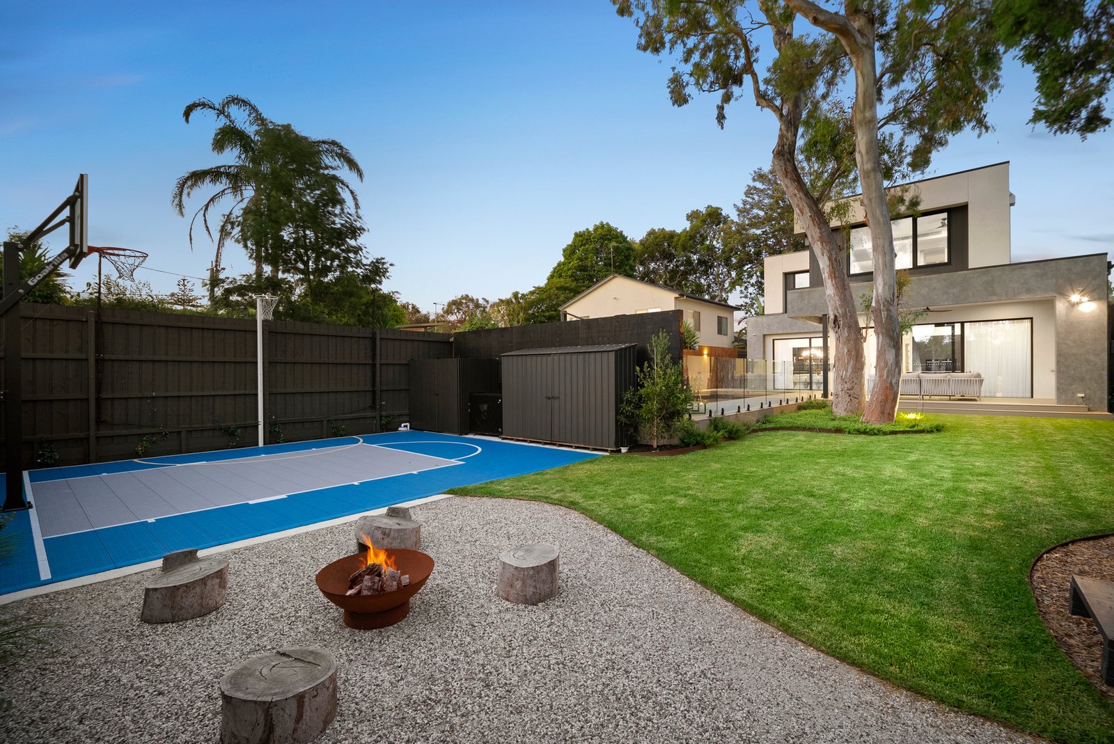 Here, a comprehensive outdoor environment is fully realised, bringing together a vast covered deck with ceiling fan, fire pit zone, glistening swimming pool and spa, custom basketball half-court, and generous lawn for children and pets, all set within manicured, low-maintenance gardens.