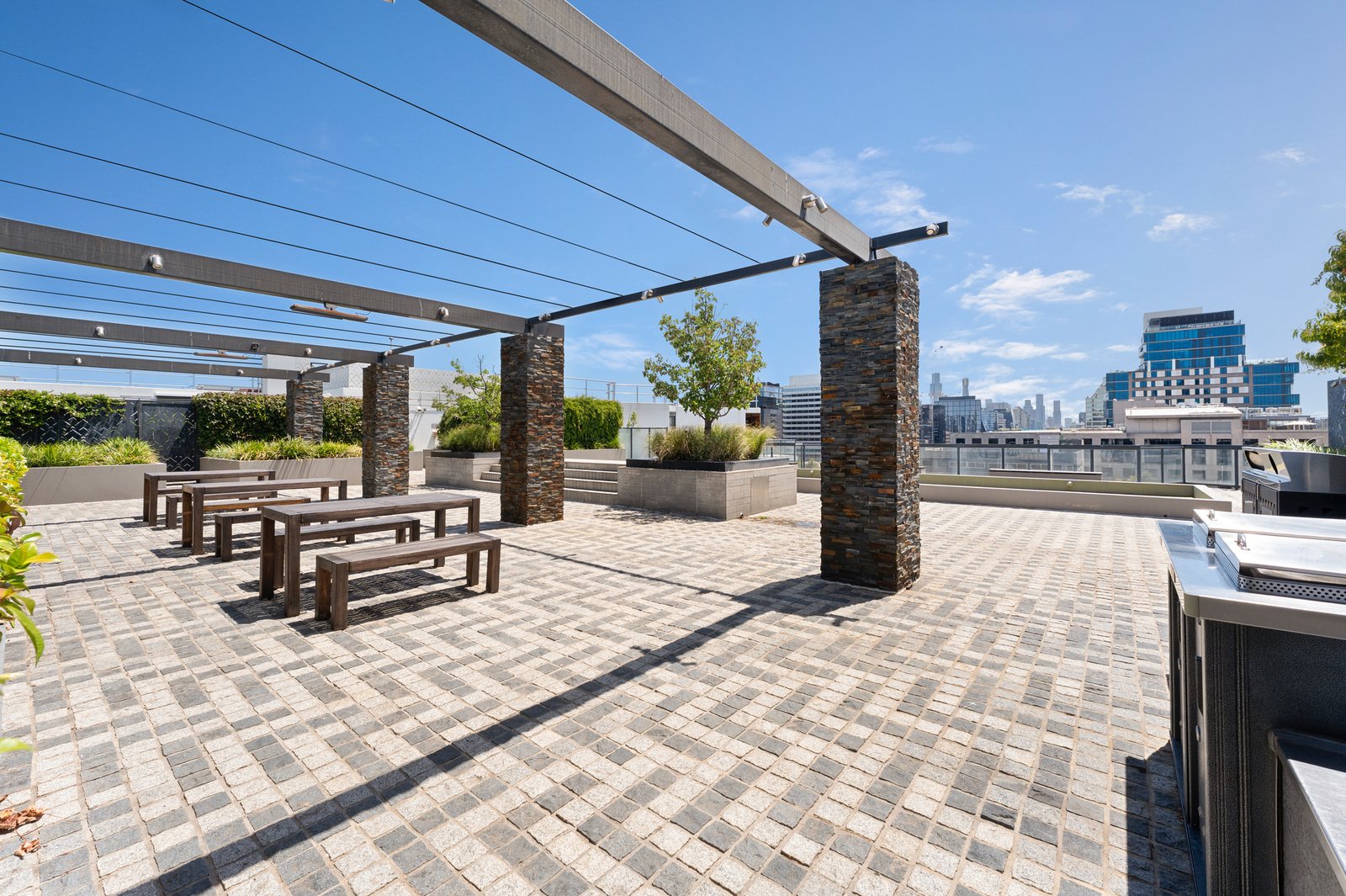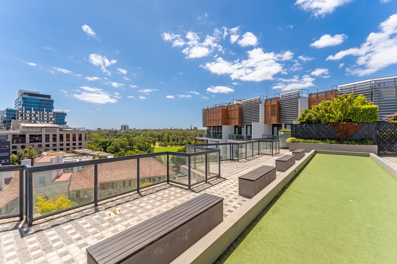 Residents of Chevron Green enjoy resort-style amenities, including a heated infinity edge swimming pool, spa, fully equipped gymnasium, BBQ facilities, an on-site building manager, and undercover visitor parking. The entertainer’s rooftop terrace provides a stunning background for social gatherings with expansive views across the city skyline and Fawkner Park, with additional BBQ facilities.